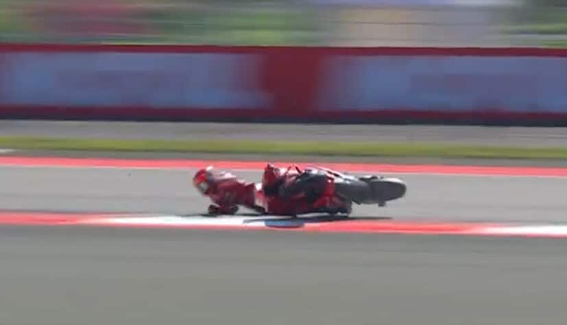 In occasione della seconda scivolata di giornata il pilota spagnolo finisce in terra in mal modo, ma si rialza repentinamente. Pilota ok