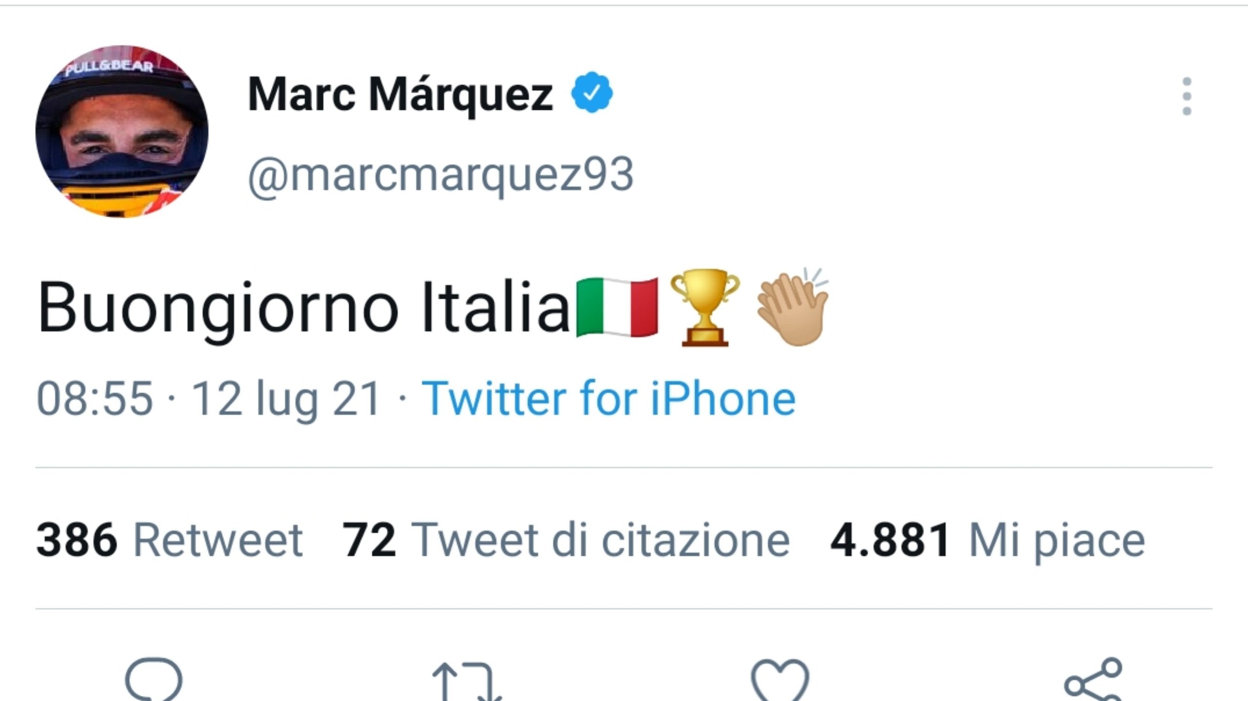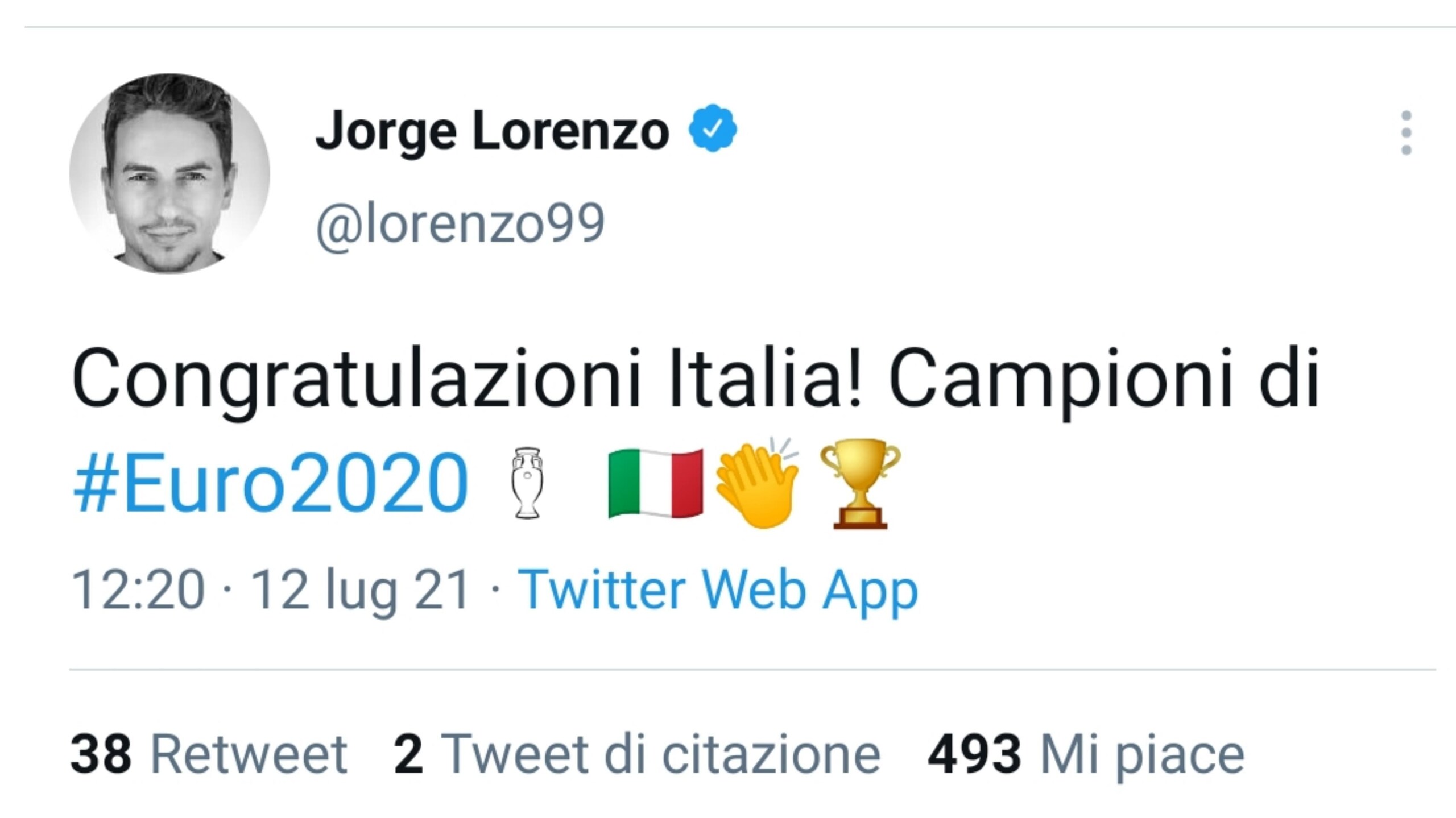 L'entusiasmo per il trionfo degli azzurri a Euro 2020 ha contagiato anche i piloti del Motomondiale, che hanno mostrato la loro gioia attraverso i social. Alla Nazionale di Roberto Mancini sono giunti anche i complimenti di Marc Marquez e Jorge Lorenzo