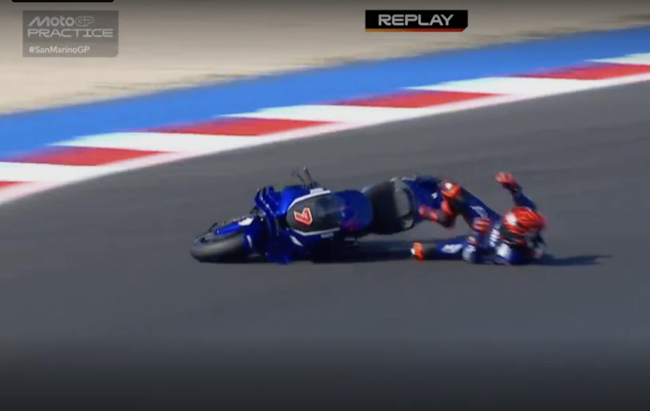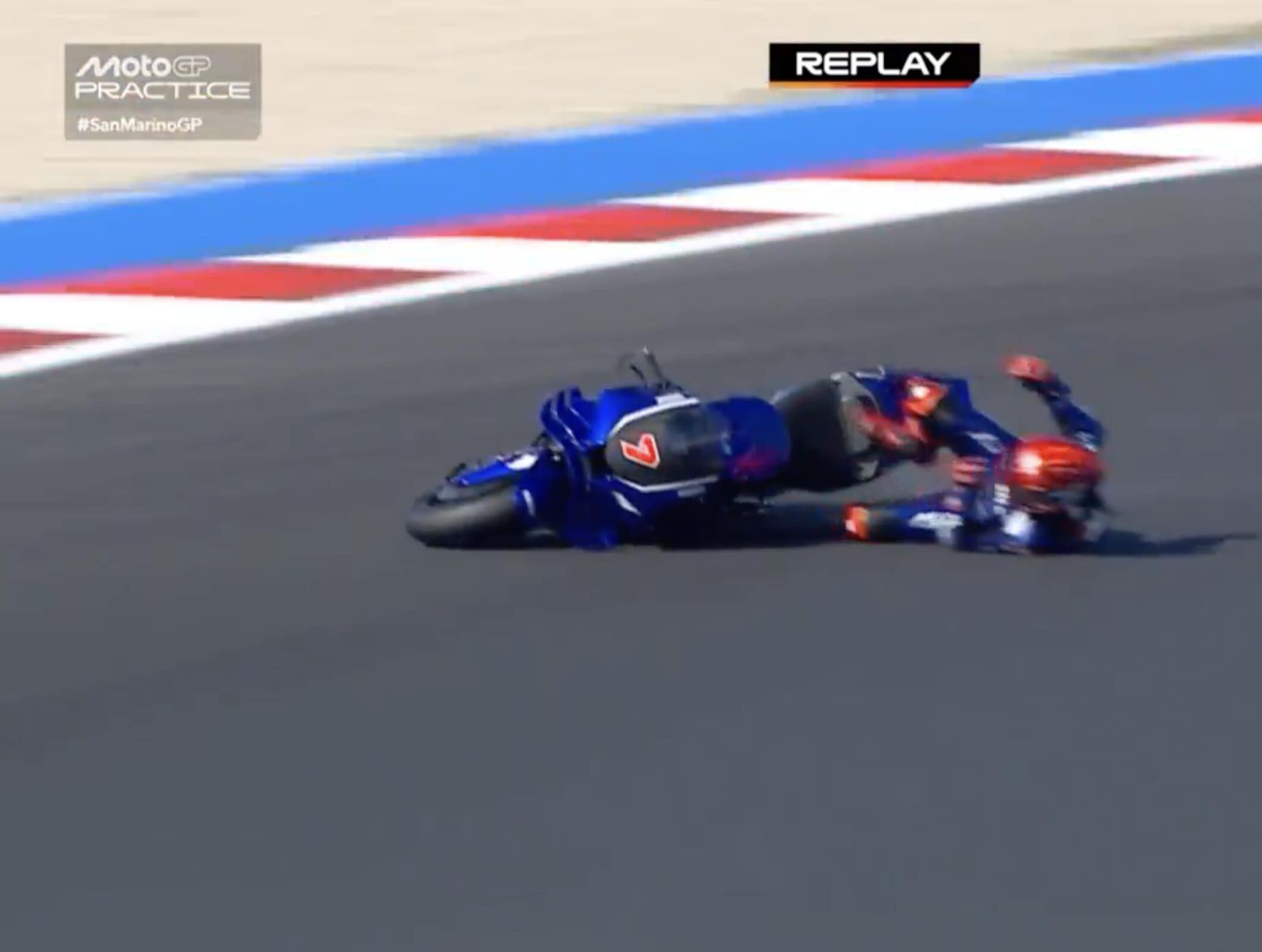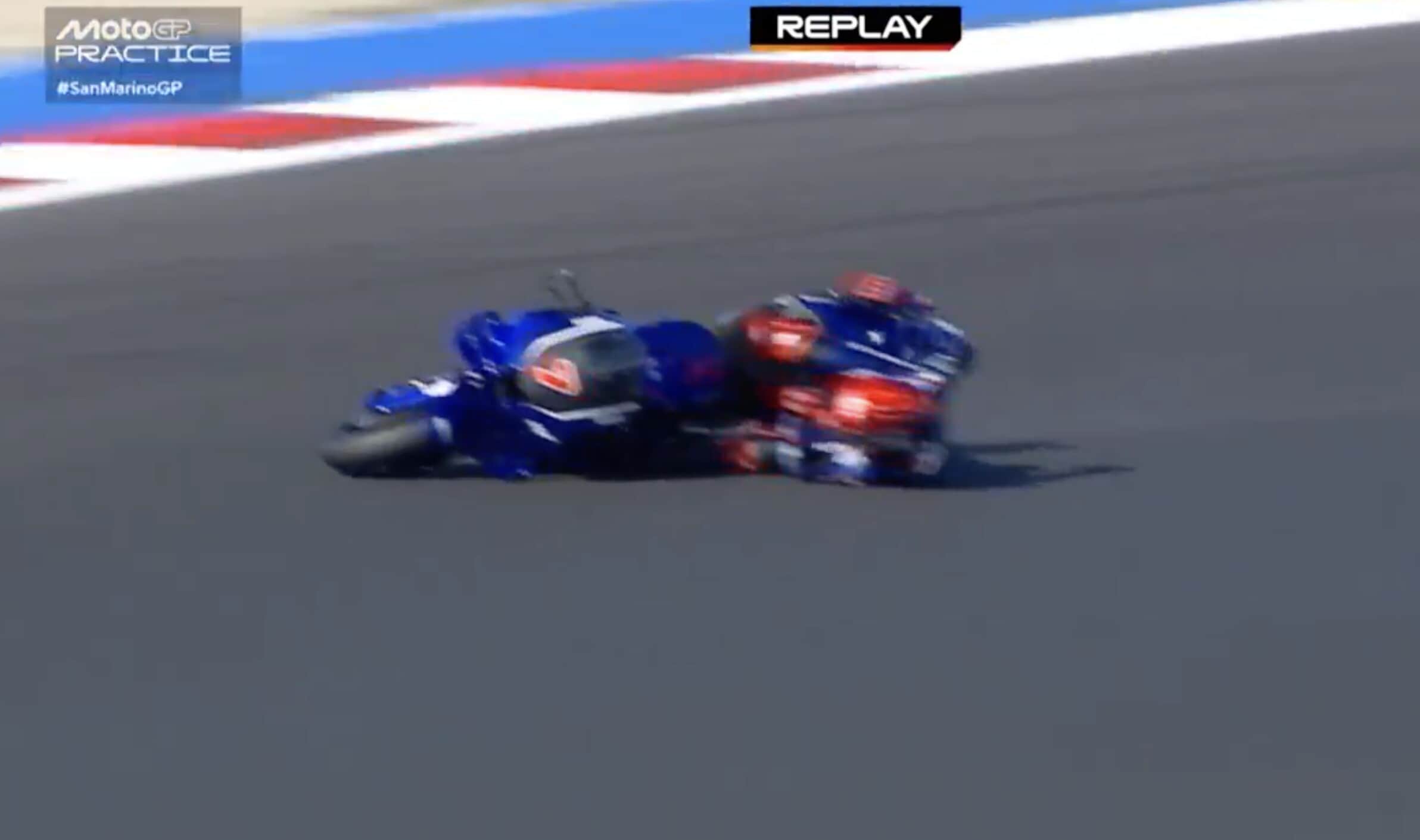Il collaudatore della Casa di Iwata è scivolato alla guida della moto prototipo con il nuovo motore. Ecco la sequenza della scivolata a Misano