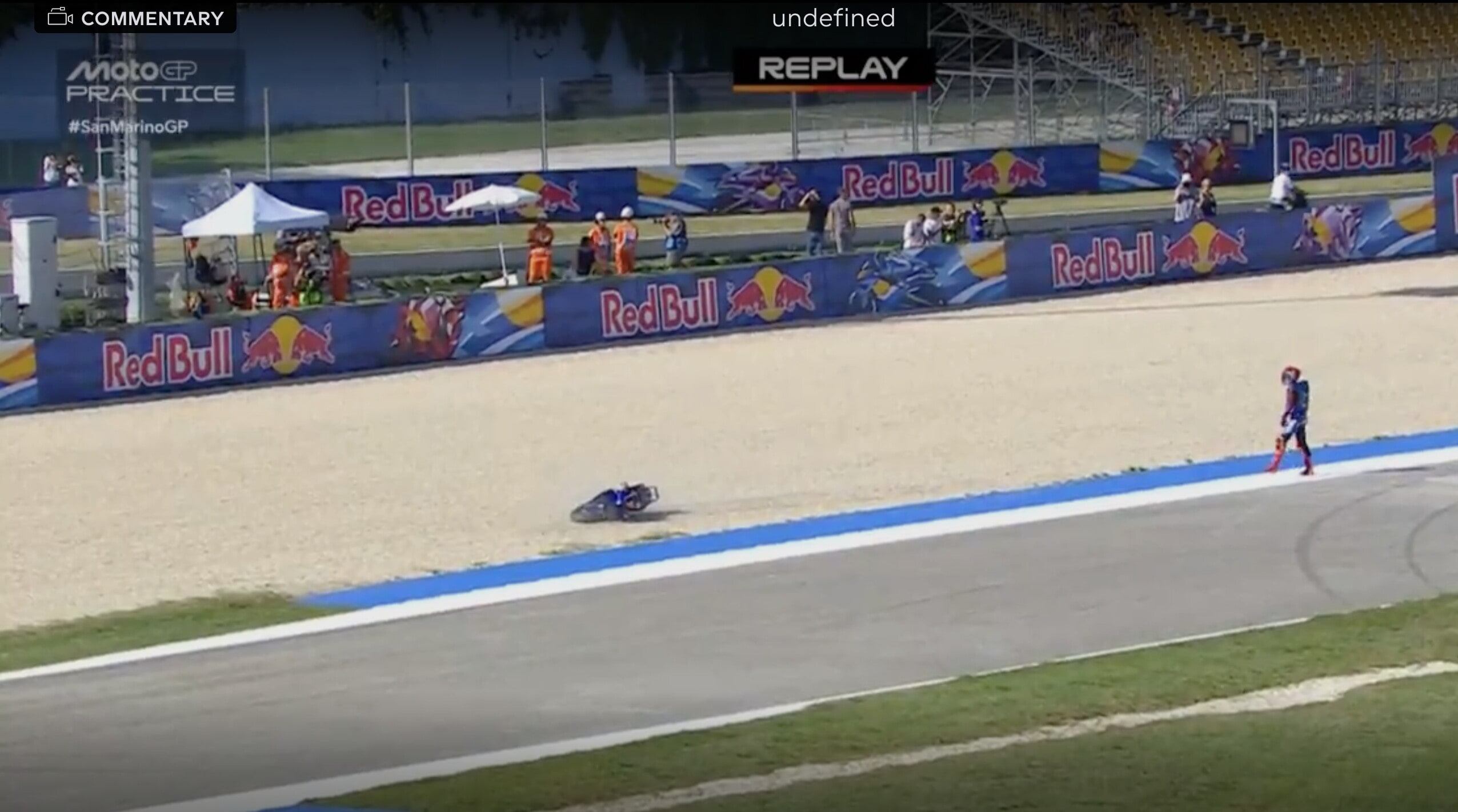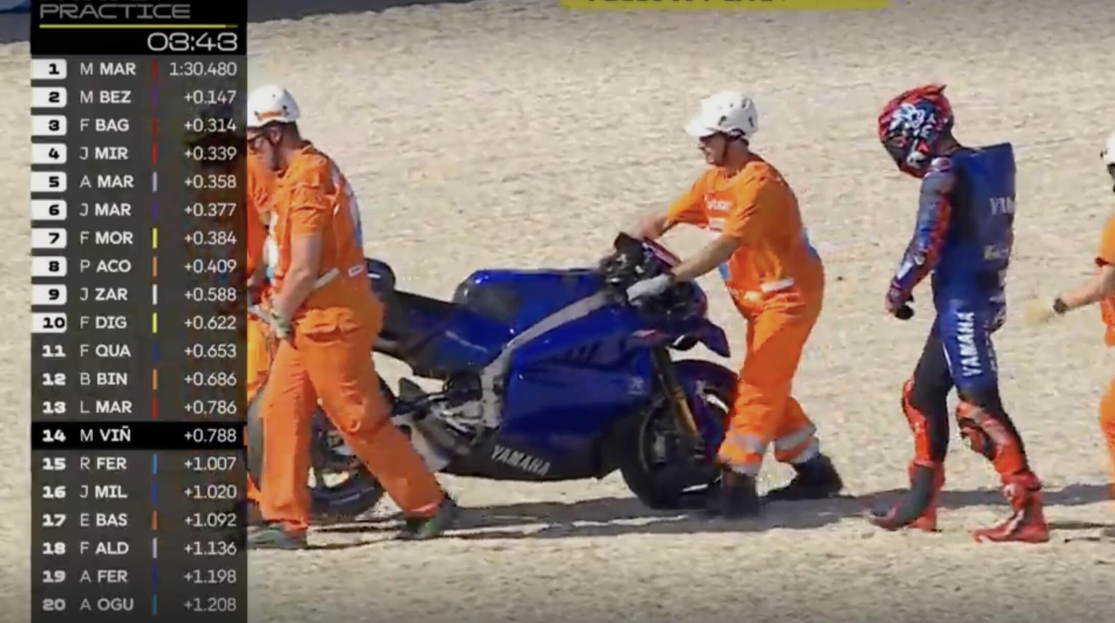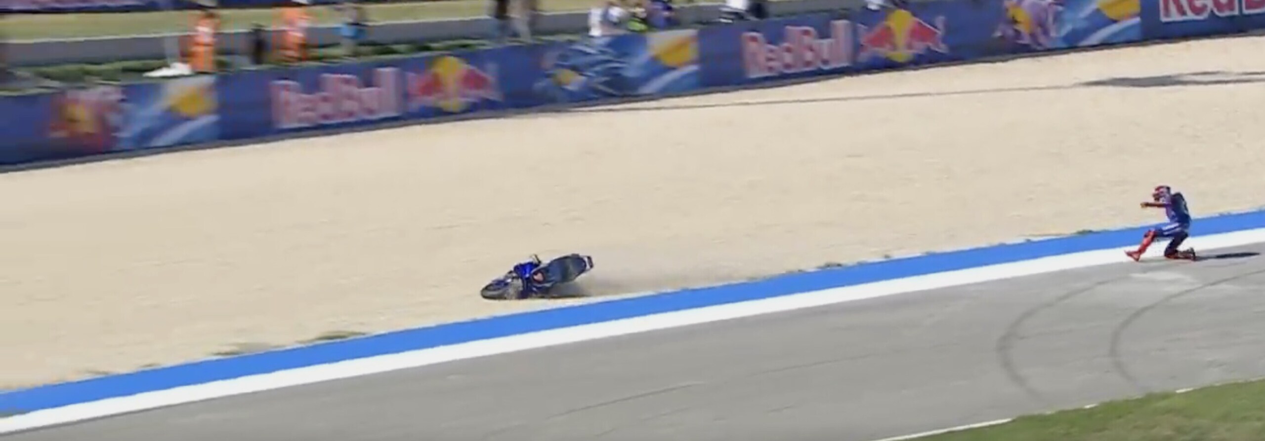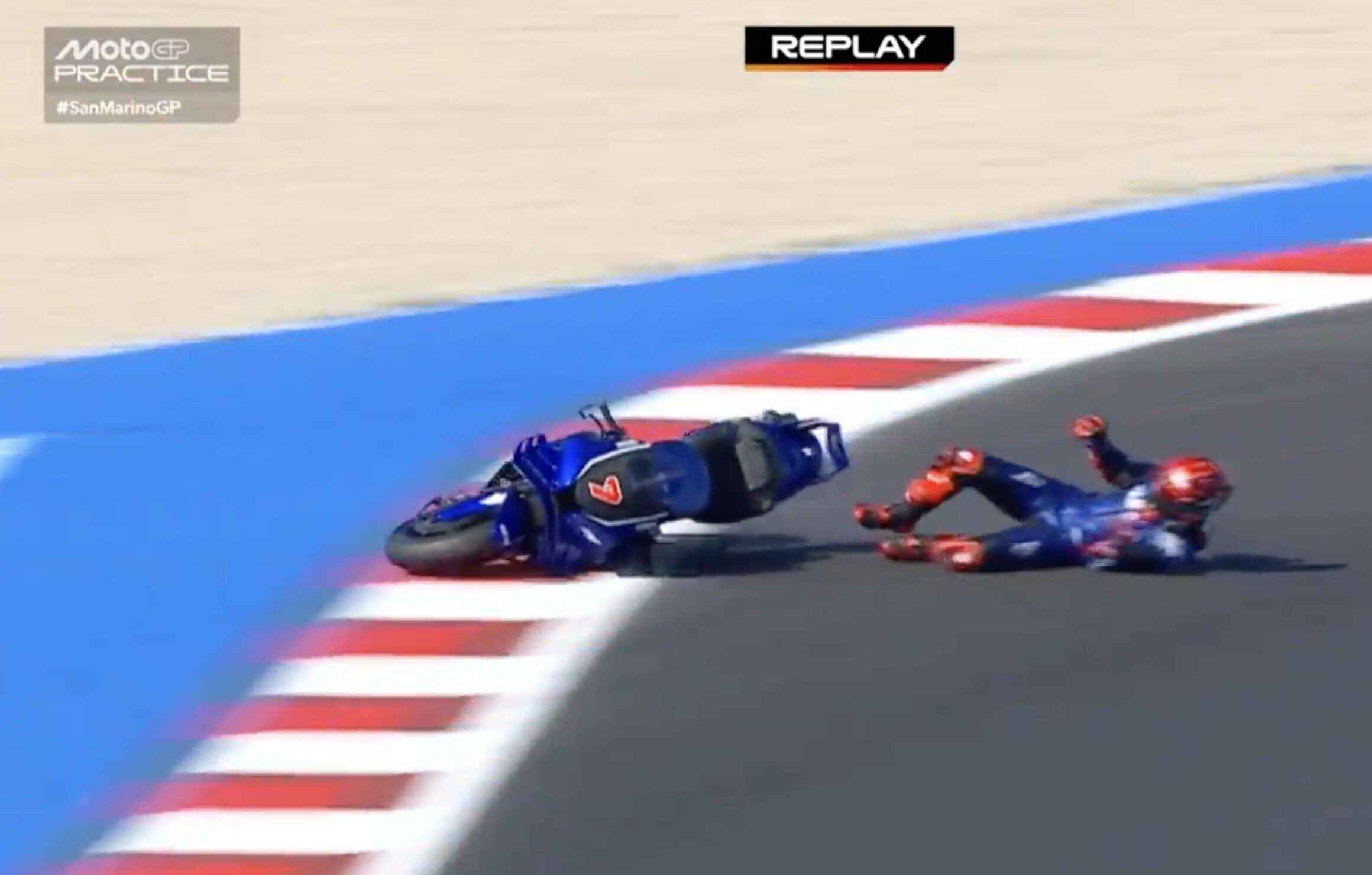 Il collaudatore della Casa di Iwata è scivolato alla guida della moto prototipo con il nuovo motore. Ecco la sequenza della scivolata a Misano