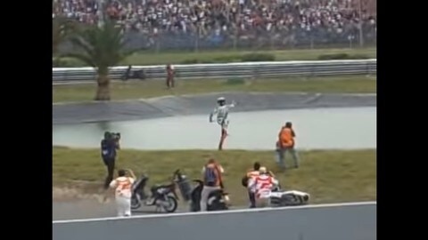 After winning, Jorge celebrating by jumping into the lake at the circuit but his helmet and suit almost caused him to drown, the rider eventually fished out by marshals