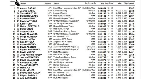 Con il pilota del team Rivacold Snipers i distacchi si alzano vertiginosamente anche se c'è da dire che l'ultima parte di sessione, solitamente dedicata all'attacco al tempo, è stata condizionata come detto da qualche goccia d'acqua. Fenati si ferma dunque a poco più di 8 decimi dalla vetta, mostrando tuttavia un buon feeling con la pista di Termas De Rio Hondo. Sesto tempo per Xavier Artigas il quale precede Kaito Toba e un ottimo Matteo Bertelle, ottavo e saldamente in top ten. Deniz Oncu e Scott Ogden completano la top ten mentre Stefano Nepa occupa la tredicesima posizione a 1 secondo e tre. Per Nepa un week-end che si presenta in salita sebbene siamo solo al primo assaggio del week-end. Bilancio positivo per il rientrante (sostituisce l'infortunato Lorenzo Fellon nel team CIP Green Power) Andrea Migno, quindicesimo a un secondo e mezzo dalla vetta e abile nel mostrarsi particolarmente a suo agio con la sua KTM.