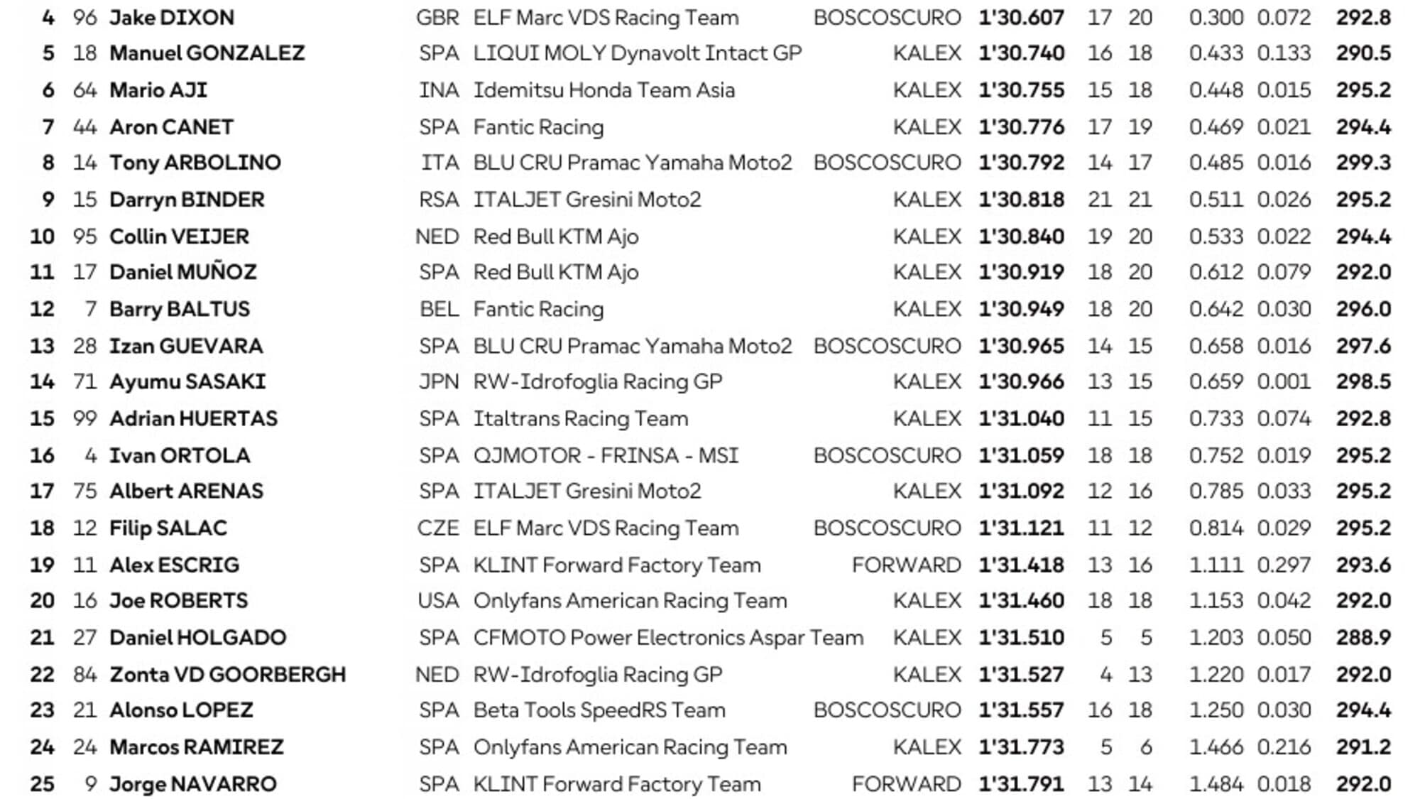 Piazza d'onore per l’idolo di casa Senna Agius, che ha sfiorato il colpaccio davanti al suo pubblico, fermandosi a soli 8 millesimi da Moreira. Una prestazione maiuscola per l’australiano, che ha trovato subito il ritmo su una pista che conosce al meglio. Terzo tempo per David Alonso, autore di un ottimo inizio di un week-end in cui potrà essere protagonista, il colombiano sembra avere tutto per giocarsi un ruolo da protagonista nel weekend, mentre ai piedi del podio virtuale troviamo Jake Dixon, quarto a tre decimi esatti da Moreira. Bene anche Tony Arbolino, il migliore degli italiani e settimo a meno di sei decimi da Moreira.