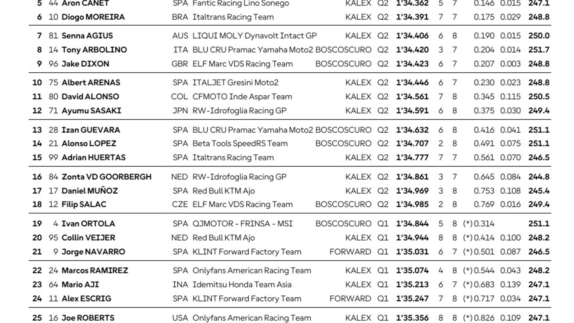 Jake Dixon e Albert Arenas completano la top ten, precedendo David Alonso, ancora non totalmente a suo agio sul layout sanmarinese, e a seguire Ayumu Sasaki e Izan Guevara. In difficoltà Joe Roberts, 25esimo, davanti alla wild card Alberto Surra; indietro anche David Munoz, 17esimo e Filip Salac, 18esimo. Con queste premesse, la gara di Misano promette di essere una sfida serrata tra Holgado, in grande condizione, Vietti e Gonzalez, i tre piloti che al momento sembrano avere qualcosa in più sul passo.