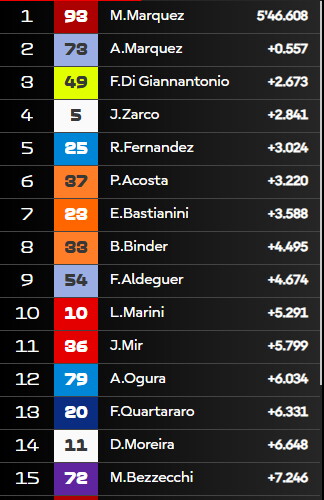 Marc e Alex si prendono un gran vantaggio sul resto del gruppo con Zarco terzo a +2.535 dal leader. Intanto entra nel vivo la lotta tra il francese e Diggia