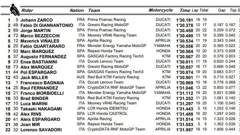 Enea Bastianini è il miglior rappresentante Lenovo ufficiale, Alex Marquez è caduto, senza rimediare danni fisici. Cercavamo le KTM Factory? Ci sono, con Jack Miller dodicesimo e Brad Binder sedicesimo. Luca Marini si trova piuttosot in basso rispetto a quanto pronosticato, arriverà l'accordo con Honda Repsol HRC?