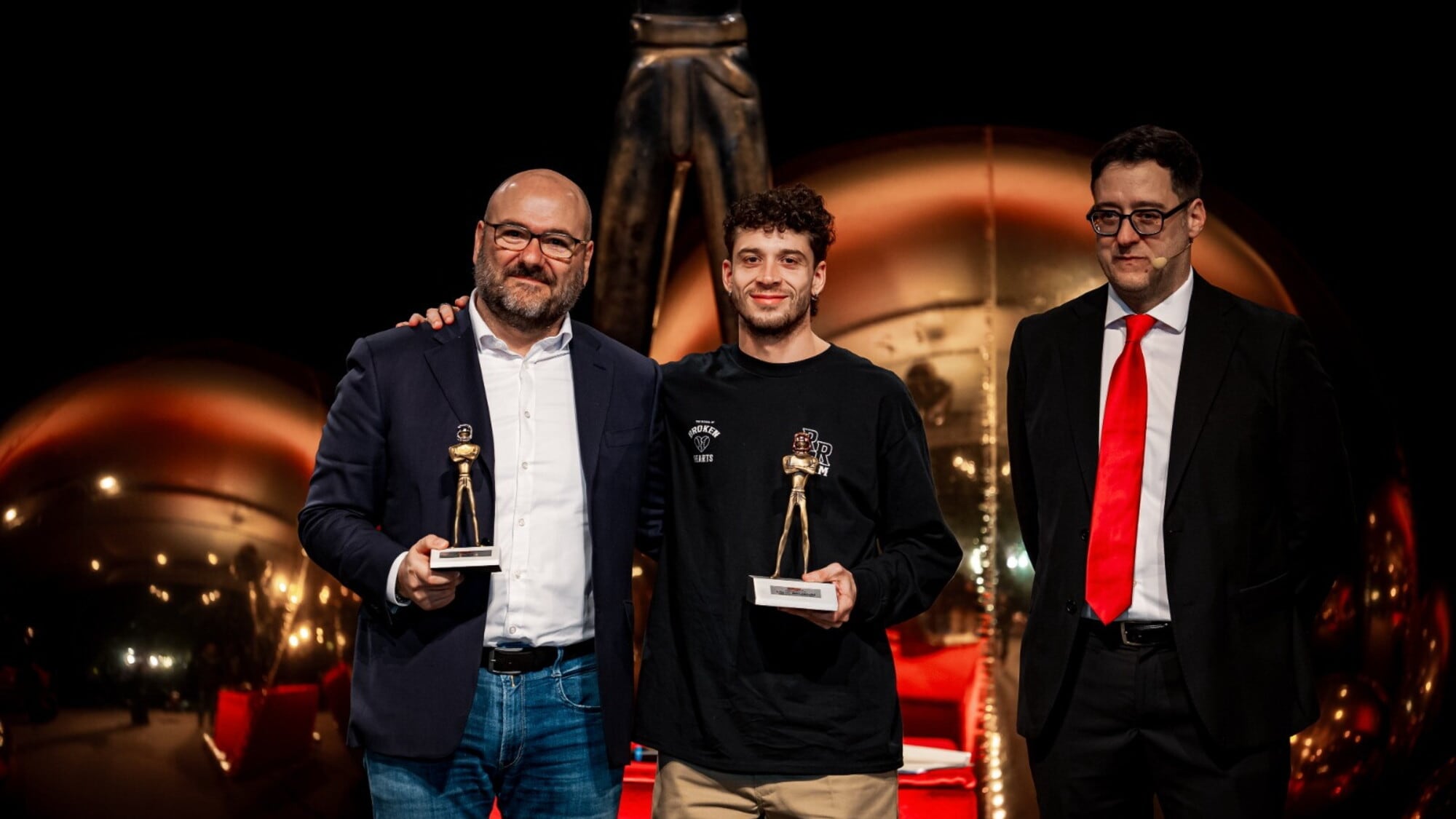 Tanta MotoGP, ovviamente, con la Ducati vincitutto rappresentata da Mauro Grassilli e Davide Tardozzi, ma soprattutto i piloti. Da Enea Bastianini premiato per la resilienza a Luca Marini celebrato per la crescita esponenziale sulla Honda fino all’uomo più atteso, Marco Bezzecchi, sul palco assieme a Fabiano Sterlacchini come volto copertina dell’Aprilia che ha saputo vivere la migliore stagione nell’era MotoGP. «Mi scuso se non sono elegante come Marini» ha scherzato il romagnolo che porterà l’RS-GP “sposata” a Sepang in viaggio di nozze «In giro per il Mondo». «Ma deve chiedere a me, sono il padre della sposa» ha rivendicato il ruolo Sterlacchini, direttore tecnico di Noale.