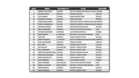 Compaiono i nomi dei debuttanti Remy Gardner e Raul Fernandez, che rimarranno compagni squadra anche sotto le insegne del Team Tech3. Entrambi manterranno i numeri utilizzati in Moto2, ovvero il 25 per Raul e l’87 per Remy. L’altro rookie Fabio Di Giannantonio, pronto al grande salto con Gresini Racing, abbandonerà il 21 (già proprietà di Franco Morbidelli) per il 49. Darryn Binder, pronto al salto dalla Moto3 alla MotoGP, manterrà il numero 40.