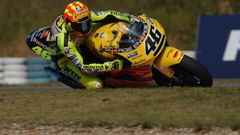 Il primo campione di questa nuova epoca fu Valentino Rossi che vinse nella stagione inaugurale della MotoGP continuando la striscia vincente cominciata qualche anno prima, guadagnandosi il soprannome “l’uomo dei due mondi”.