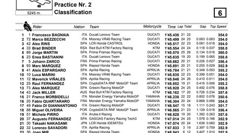 Ottava posizione per Marc Marquez, nonostante la caduta in curva 14 a 7 minuti dalla fine del turno, con Aleix Espargarò e Luca Marini a chiudere la top ten, nonostante gli acciacchi fisici. Fuori per millesimi Maverick Vinales e Raul Fernandez, mentre proseguono le difficoltà di Yamaha. Franco Morbidelli infatti è il primo pilota di Iwata in 15° posizione, davanti ad un Fabio Quartararo costretto ad abortire l’ultimo giro a causa delle bandiere gialle.