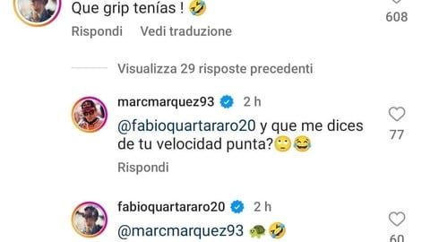 Marc ha ribattuto prontamente: “E cosa mi dici della tua velocità di punta?”, una domanda sarcastica alla quale Fabio ha risposto con l’emoticon di una tartaruga, ironizzando sulla scarsa velocità di punta della sua M1.