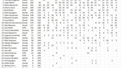 Detto di Bagnaia e Martin anche nelle posizioni appena giù dal podio stagionale cambiano di molto i valori in campo con Brad Binder che invece di essere già certo del quarto posto in classifica grazie ai 100 punti conquistati nelle Sprint, senza quest’ultimi scivolerebbe in quinta posizione passato da un Johann Zarco che invece il sabato ha conquistato solamente 36 dei suoi 204 punti. In questa speciale classifica guadagnerebbero due posizioni anche Fabio Quartararo che passerebbe così dalla nona alla settima per via dei soli 19 punti conquistati al sabato e soprattutto il pilota più chiacchierato del momento: Fabio Di Giannantonio. Il romano infatti se si fossero corsi solo i GP sarebbe addirittura in Top10 stagionale con 119 punti superando il compagno di squadra Alex Marquez fermo a 117. Diggia infatti nelle Sprint ha totalizzato solo 15 punti (il punteggio più basso tra i piloti della top10), mostrando di meritare una chance nella MotoGP 2024.