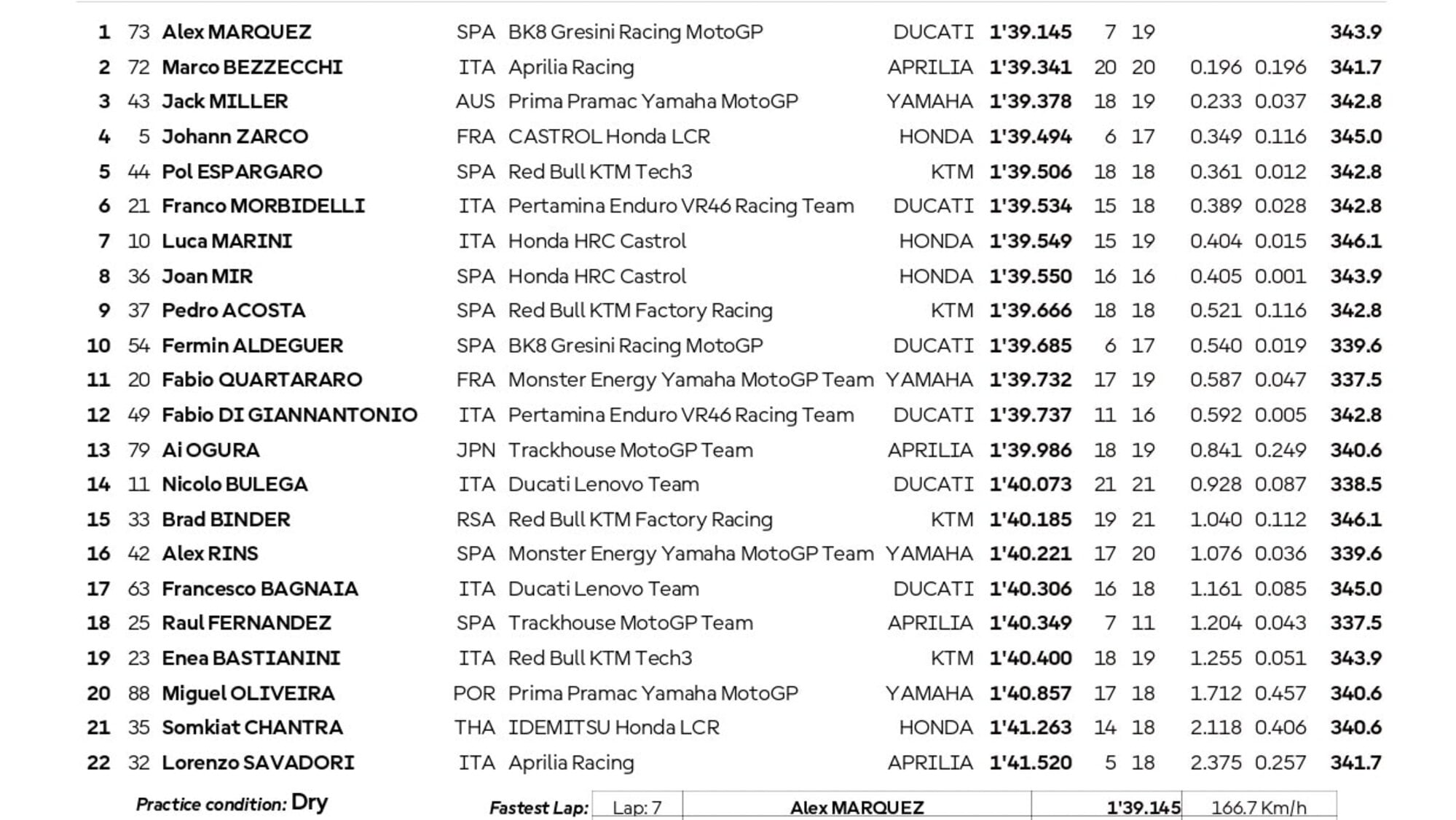 Settimo Luca Marini, diciannovesimo Enea Bastianini, ventiduesimo Lorenzo Savadori. Discorso a parte per i due italiani tinti di Rosso: Nicolò Bulega è quattordicesimo, Pecco Bagnaia diciassettesimo. I rispettivi crono: 1'40"073, 1'40"306.