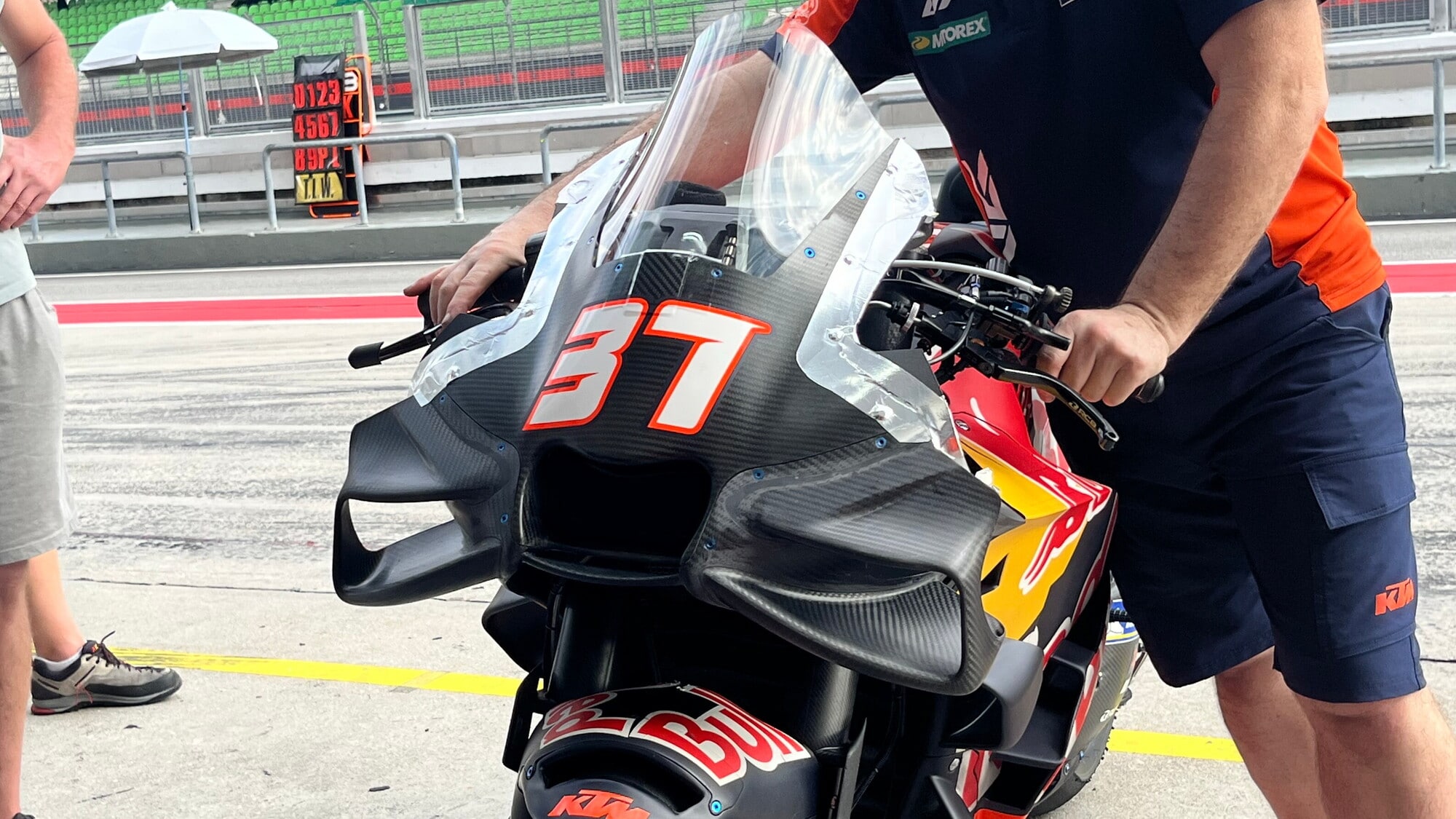 Differente anche la parte frontale. Se la bocca dell'airbox e le due ali frontali sembrano essere rimaste pressoché identiche al passato, il cambiamento evidente risiede nella forma del cupolino, ora molto più spigoloso e soprattutto stretto ai lati, offrendo meno copertura al pilota (compensata da una piccola porzione a spigolo che sbuca sui lati) ma anche una diversa gestione dell'aria che impatta sulla moto. Acosta ed Enea Bastianini ieri si sono detti soddisfatti delle nuove parti, ma il tempo dei giudizi non è ancora terminato.