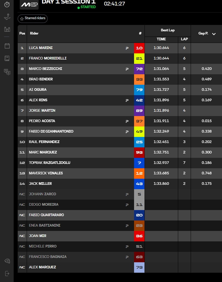 Comanda Luca Marini in gran forma in questi primi minuti. Lo segue Franco Morbidell in cerca di riscatto in questo 2026 e terzo Bezzecchi a +0.420. Ancora ai box Pecco, Zarco, Moreira e Bastianini