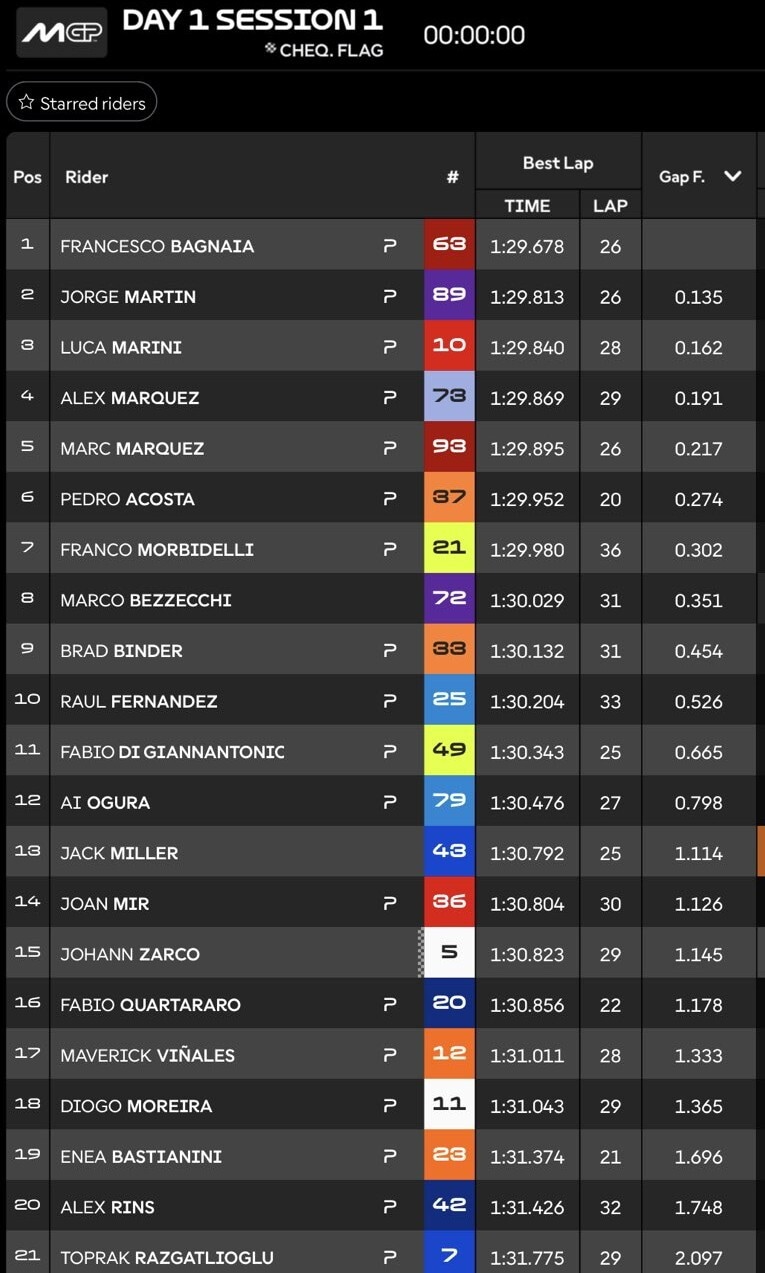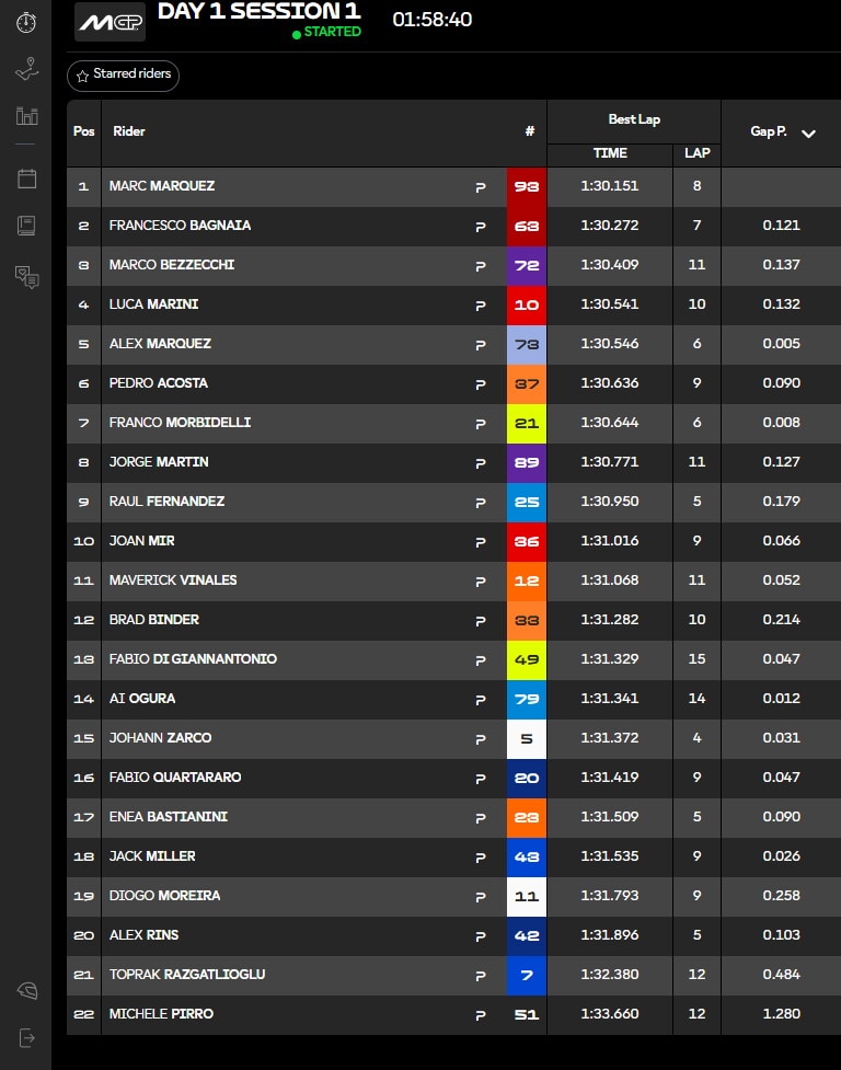 Il pilota Ducati segno un miglior tempo di 1:31.231. Il fratello Alex sulla Gresini Racing in quinta casella a +0.395 dall'attuale campione del mondo in carica. Diogo Moreira della Honda LCR è attualmente il debuttante più veloce, al 20° posto, mentre Toprak Razgatlioglu della Pramac Yamaha è al 21°.