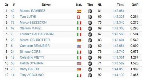 Avendo già confidenza con la propria moto fornita dall’American Racing Team, primo fra tutti in questa ultima giornata a Jerez è lo spagnolo Marcos Ramirez che, nei suoi 81 giri effettuati, ha siglato il tempo di 1’42.064 con cui precede di due decimi lo svizzero Tom Luthi, che ha iniziato a prendere confidenza con la nuova moto del SAG team.