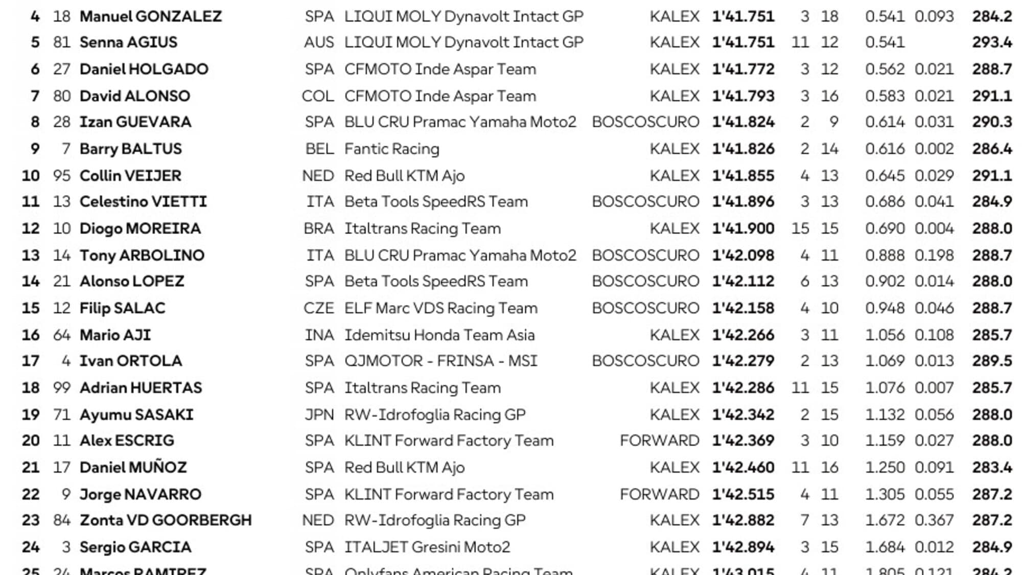 Da segnalare l’ottimo quinto posto di Senna Agius, a pari tempo con Gonzalez, e la buona prova di David Alonso, settimo. Tra gli italiani, Celestino Vietti e Tony Arbolino chiudono rispettivamente undicesimo e tredicesimo, ma i due hanno dimostrato una velocità convincente soprattutto nelle condizioni d’asciutto. Entrambi possono ambire alla top ten se il meteo dovesse stabilizzarsi in vista della giornata di sabato. La top 10 si completa con Holgado, Guevara, Baltus e Veijer, racchiusi in meno di sette decimi da Canet: segno di un equilibrio che promette scintille per le qualifiche.