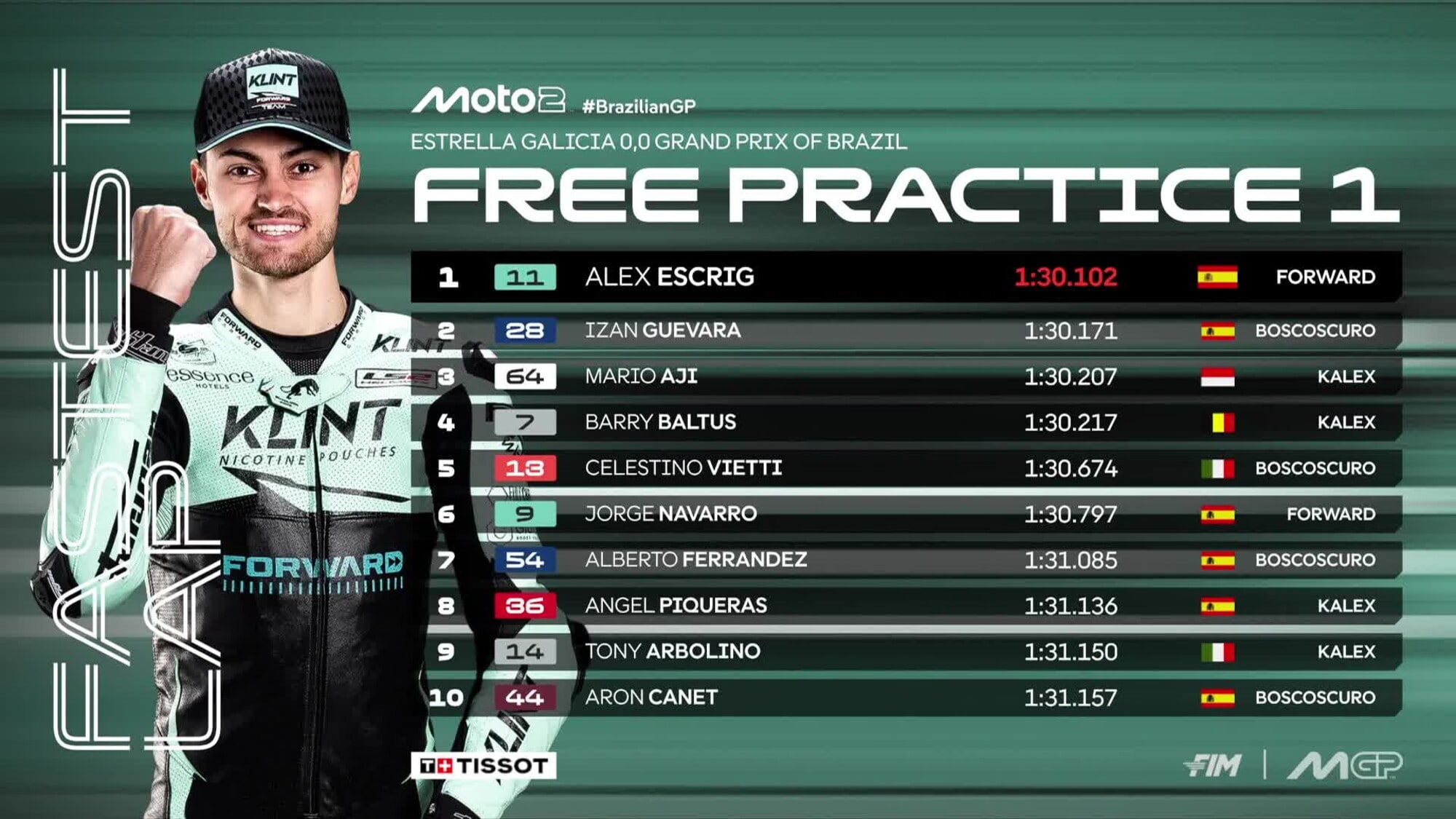 Il ritorno del Motomondiale in Brasile, a distanza di quasi vent’anni dall’ultima volta, comincia sotto un cielo carico d’acqua. Il tracciato di Goiania ha subito messo alla prova i piloti con condizioni meteo tutt’altro che semplici, la pioggia è stata infatti protagonista dall’inizio alla fine e, in questo scenario complicato, a emergere è stato Alex Escrig, il più lucido e concreto nel gestire il tutto, capace di fermare il cronometro sull’1’30.102 e di mettere il proprio nome in cima alla classifica di una sessione inevitabilmente interlocutoria.