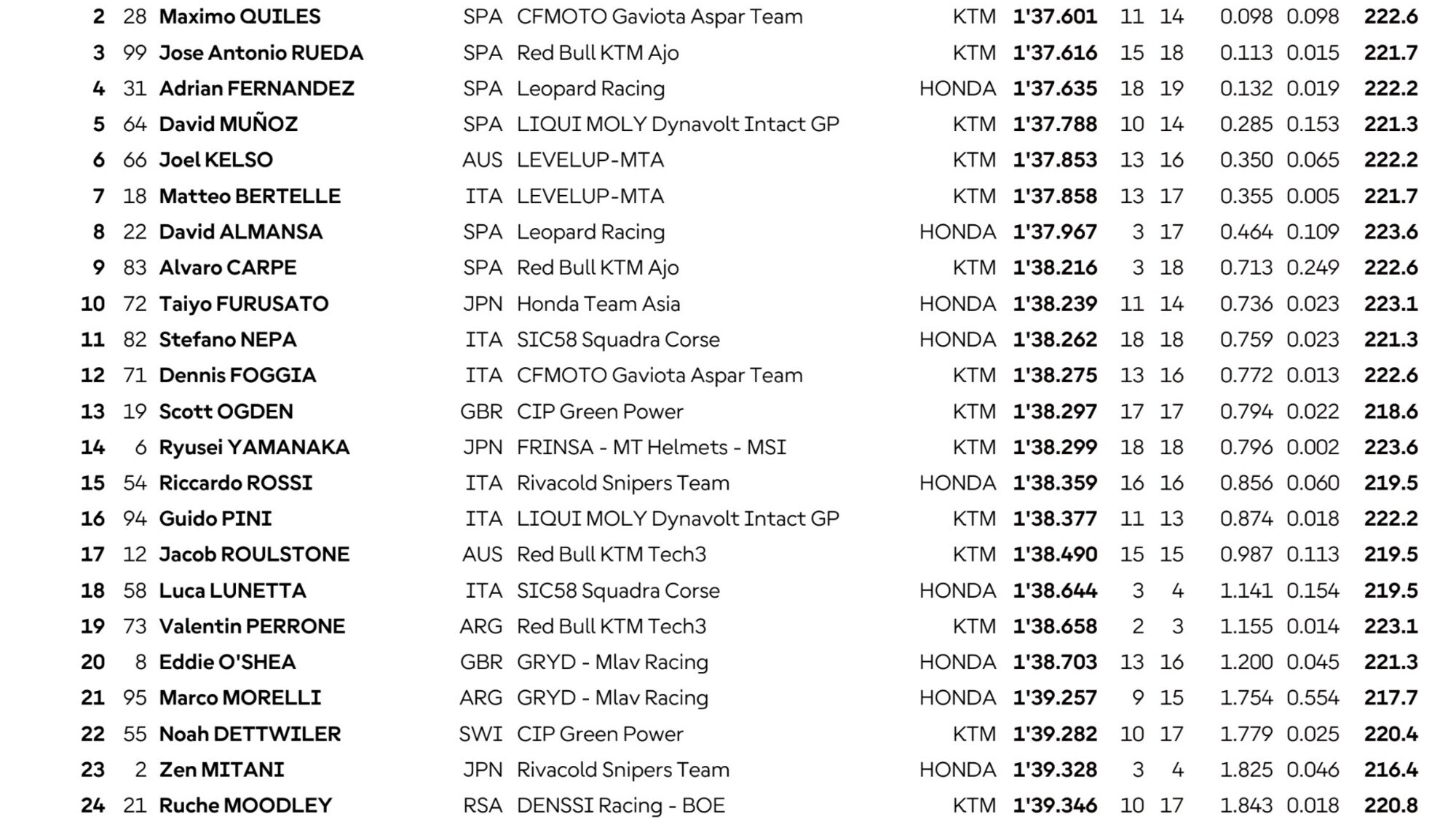 Completano la top 5 i due spagnoli Adrian Fernandez, con Honda, e David Muñoz con un ritardo di quasi tre decimi dal primo. Segue poi la coppia del team LEVEL-UP MTA con Joel Kelso che precede Matteo Bertelle, migliore degli italiani. Passano direttamente alla Q2 anche Dennis Foggia, 11esimo, e Riccardo Rossi, 13esimo. Nono Carpe, scivolato sul finale a seguito di un contatto con David Almansa, ottavo.