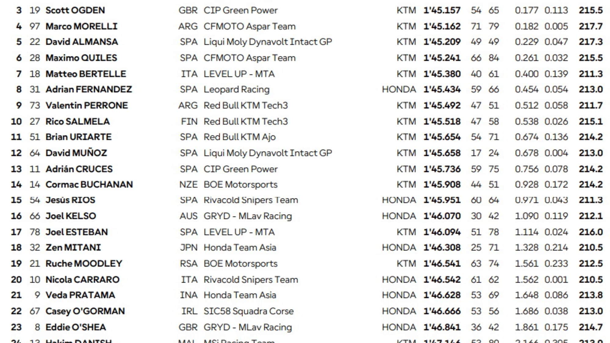 Terza posizione, un po' a sorpresa, per Scott Ogden. Il pilota inglese, in forza al team CIP Green Power, paga solo 177 millesimi dalla vetta e potrebbe essere una mina vagante del prossimo campionato. Il rookie di CFMOTO Aspar Marco Morelli chiude 4° e precede il grande favorito per la stagione Máximo Quiles (6°), che però non si è esibito nel time attack finale. Tra i due di Aspar c'è David Almansa. Settima posizione incoraggiante per il padovano Matteo Bertelle, che nel 2026 spera in una stagione regolare dopo essersi ripreso dal terribile infortunio in allenamento che lo ha tenuto ai box per gran parte del 2025. Bertelle ha fatto decisamente meglio dell'altro italiano in pista: Nicola Carraro, confermato dallo Snipers Team, ha chiuso solamente 20° la prima giornata spagnola.