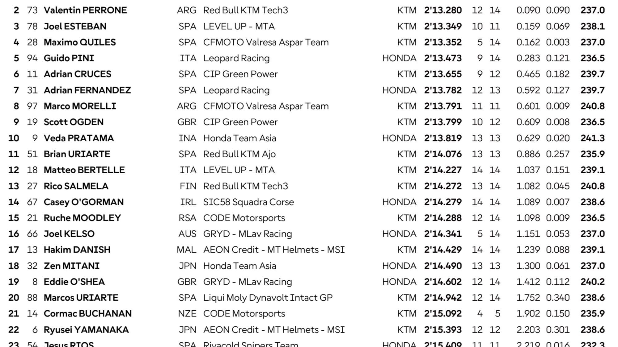 Alvaro Carpe ha conquistato il miglior tempo della sessione negli ultimi minuti finali, fermando il cronometro sul 2’13.190 precedendo così Valentin Perrone per appena 90 millesimi. Joel Esteban, molto a suo agio sulla KTM, ha firmato il terzo miglior tempo a 159 millesimi dalla vetta e ha preceduto Maximo Quiles, leader del venerdì e anche del campionato.