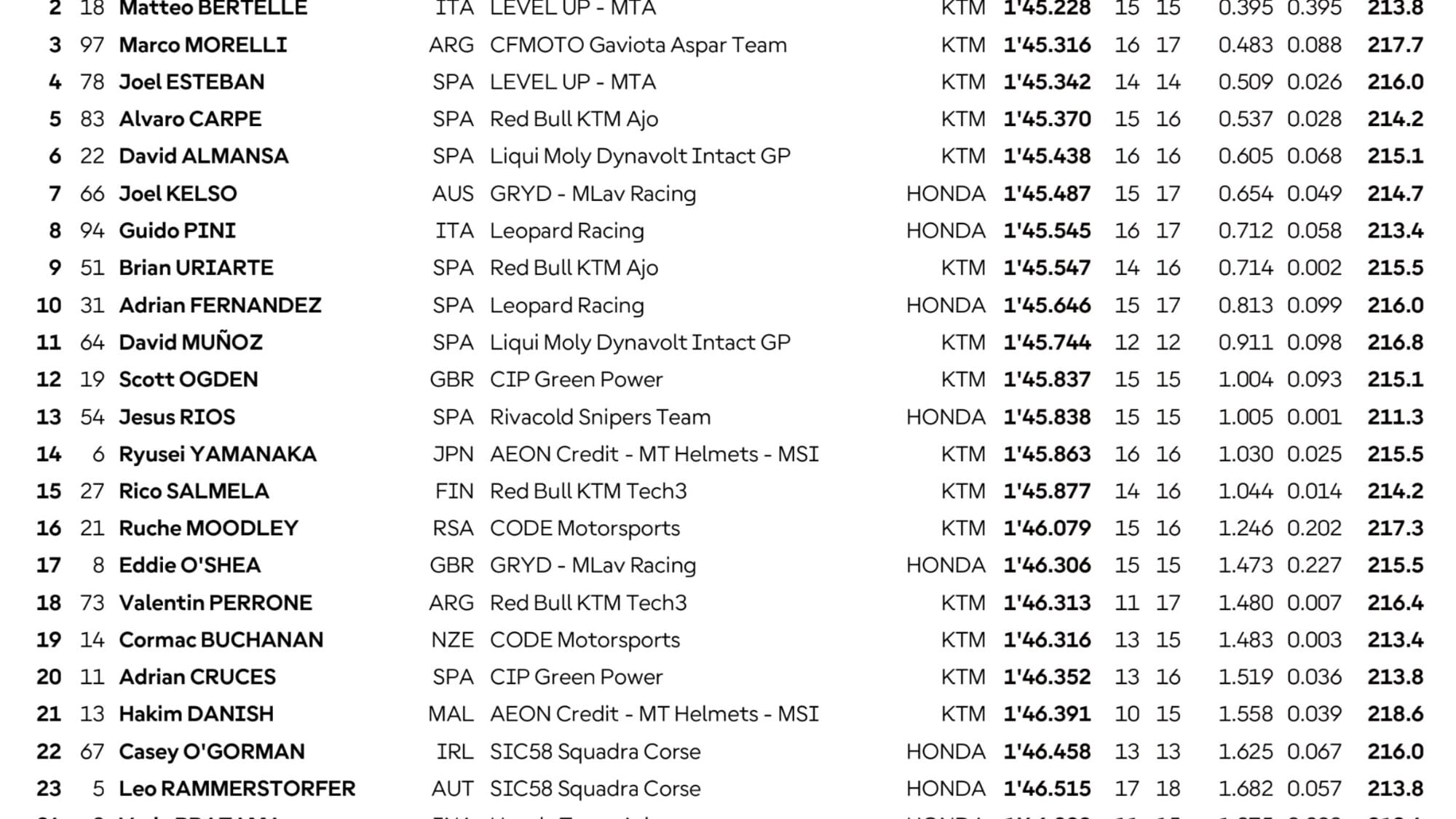 Il veneto è seguito, per 88 millesimi, dall’altro pilota del team Aspar Marco Morelli, il debuttante che promette decisamente bene su questa pista di “casa”. Quarto posto per il compagno di squadra di Bertelle, nel team LEVEL UP – MTA, Joel Esteban, a mezzo secondo dal primo. La top 5 è completata da Alvaro Carpe, che ha conquistato il suo primo podio stagionale ad Austin, il terzo posto.