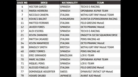 Saranno ben sei gli italiani al via, visto che troveremo in pista anche Kevin Zannoni, Mattia Casadei, il rientrante Niccolò Canepa e gli esordienti Kevin Manfredi e Alessio Finello. Saranno però tanti i piloti da tenere d'occhio, tra i quali spiccano Bradley Smith e lo spagnolo Xavi Forès, al via con il team Pramac al fianco di Manfredi. Confermata inoltre la presenza di Maria Herrera, nuovamente con il team Aspar.
