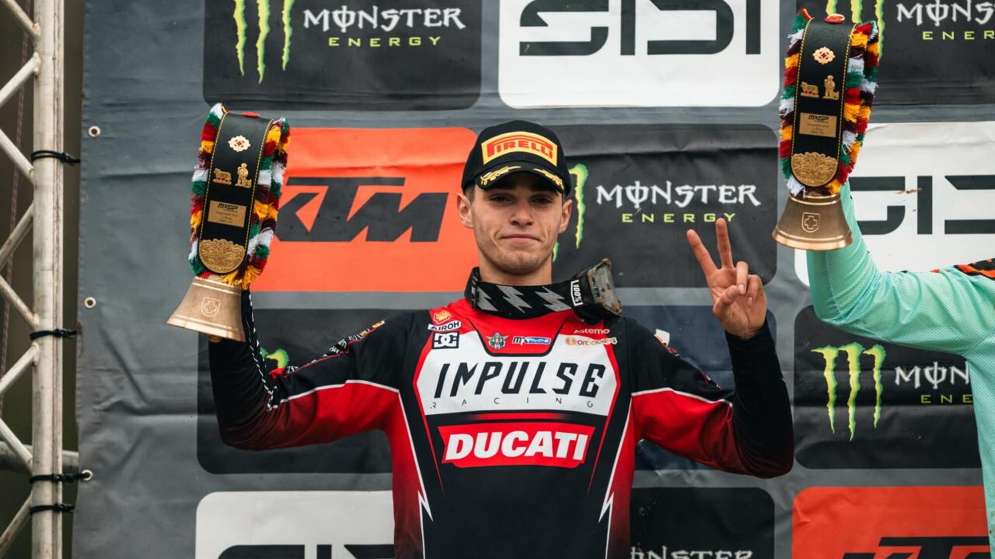 Sul podio Garcia è primo davanti all’italiano al primo podio in EMX250 che regala alla casa di Borgo Panigale e al Team Beddini una prova di carattere dopo il disastro della Spagna e a Canon, con la rivelazione brasiliana, Bernardo Tiburcio (Yamaha), 4° assoluto davanti a Owens. Buona la prova di Nicolò Alvisi (Honda) 8° assoluto alla seconda gara col Team Maddii e di Rispoli, 12° con la Beta del MRT, mentre Niccolò Mannini (Triumph) è 14°. In campionato Garcia comanda con 100 punti, 27 più di Canon.