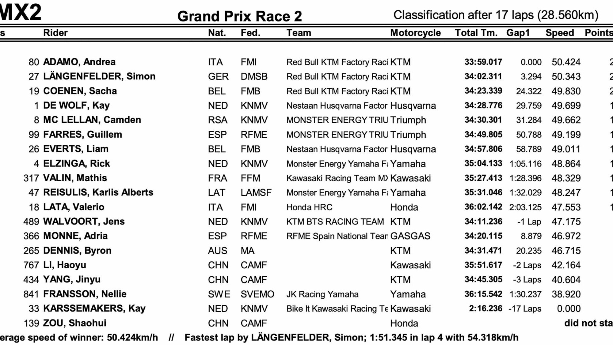 Al via era stato proprio il leader del mondiale a prendere il comando precedendo il vincitore di gara uno, nonché compagno di squadra Sacha Coenen (KTM), con Adamo terzo e Kay de Wolf (Husqvarna), 4°, mentre Valerio Lata (Honda), scattato bene, sembra soffrire la stanchezza per la prima manche. Il ritmo dei primi tre è infernale e il Campione del Mondo in carica non riesce a inserirsi nel gruppo, con Adamo che poco prima della metà gara passa Coenen e si mette in caccia di Langenfelder. La tabella rossa è prudente, mentre Coenen perde terreno con un problema alla maschera.