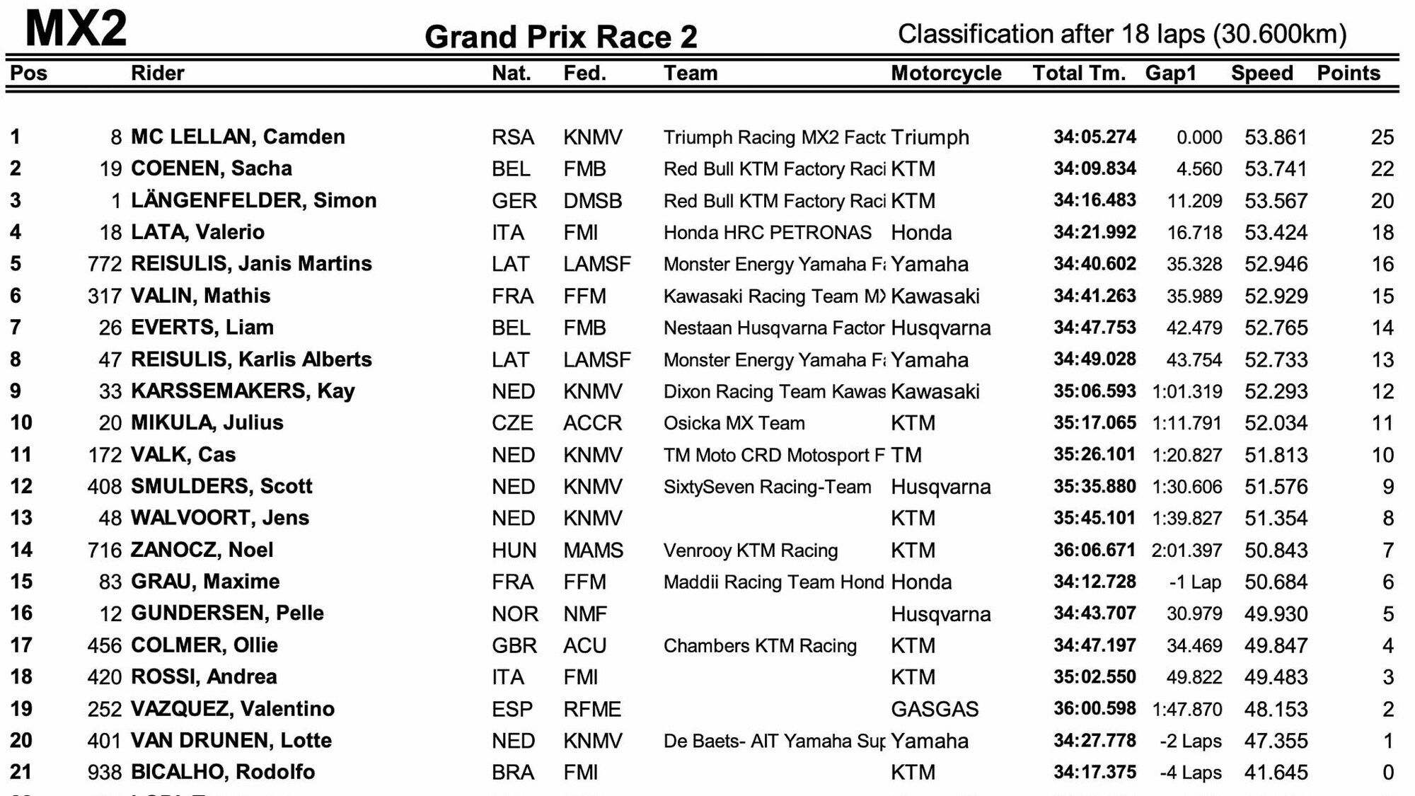 Al via della manche è Sacha Coenen (KTM) a sorprendere tutti con uno scatto che gli vale l’hole-shot, mentre Valerio Lata (Honda) riesce a infilarsi al secondo posto passando sue avversari, seguito da McLellan e Simon Langenfleder (KTM). Per la prima metà di gara, a differenza di tutto il resto del weekend, il romano guida con grinta e si tiene in scia a Coenen che non sembra poter allungare, mentre McLellan non riesce a rendersi abbastanza pericoloso da impensierirlo.