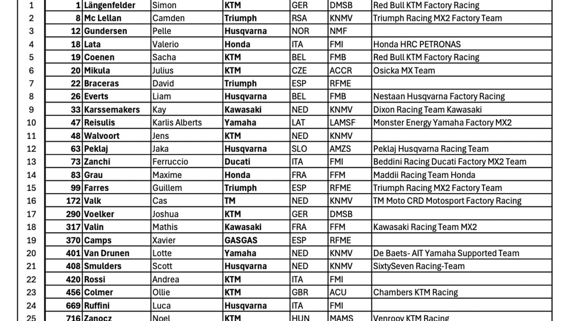 Nel radar anche Liam Everts (Husqvarna), reduce dal podio svizzero e temibile sulla sabbia quanto Coenen e Längenfelder, ma mai sul podio sardo in passato e Janis Reisulis (Yamaha) che però non ha mai corso in Sardegna in passato, così come non ha mai messo le ruote sulla sabbia di Riola Mathis Valin (Kawasaki), avendo saltato l'edizione dello scorso anno per infortunio. Conosce bene la Sardegna invece Valerio Lata (Honda), protagonista di un bel weekend a Frauenfeld prima di Pasqua e che ritroverà in gara il connazionale Ferruccio Zanchi che debutta sulla Ducati Desmo250 MX, dopo 3 gare di stop a causa di un infortunio. Per il toscano si tratta del primo GP dal Gran Premio di Francia del maggio 2025.