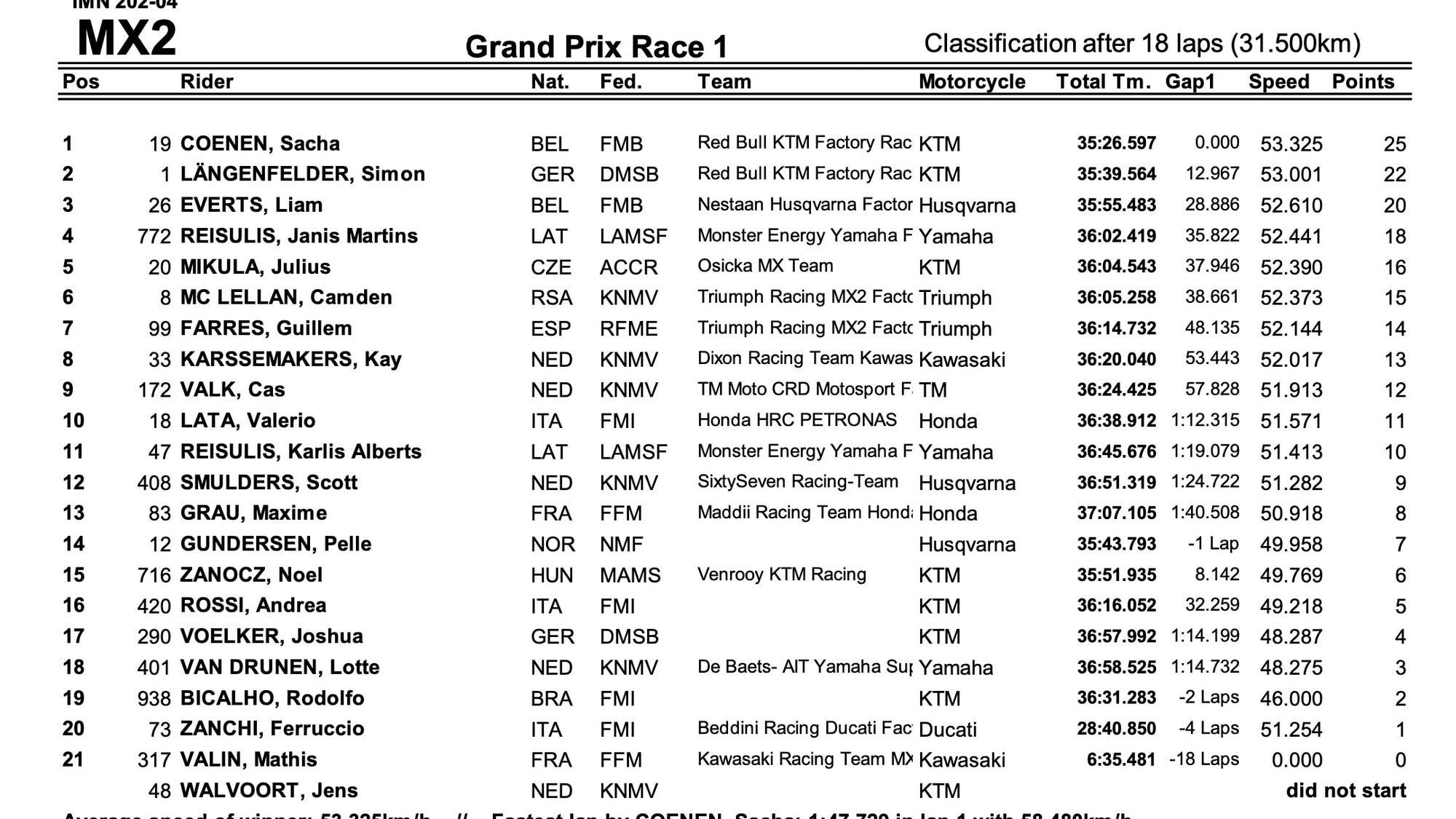 Gara buttata al vento per Guillen Farres (Triumph) che è secondo fino a due giri dal termine, quando incappa in una caduta che lo precipita al 10° posto, vanificando gli sforzi fatti per salire nuovamente sul podio, vuoto che colma più che volentieri Liam Everts (Husqvarna), 4° in gara due alle spalle di un ottimo Camden McLellan (Triumph), autore di una bella rimonta dal 10° al terzo posto finale. Il sudafricano si deve accontentare del 4° di giornata davanti a Janis Reisulis (Yamaha), con il giovane Julius Mikula (KTM) 6° assoluto. In campionato Längenfelder si porta a più 24 su Coenen, che sale al 2° posto seguito da Everts.