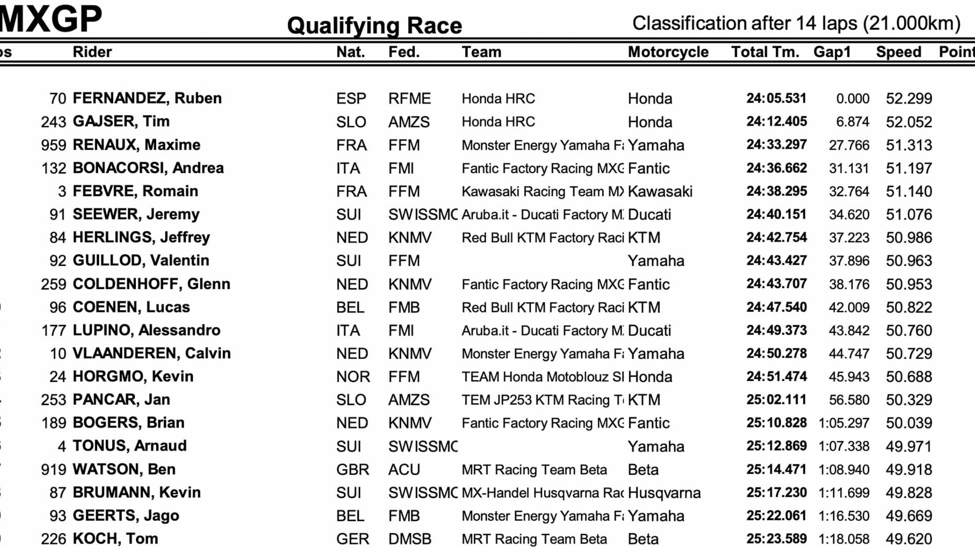 Al via della gara di qualifica è Ruben Fernandez (Honda) a prendere il comando davanti a Jeffrey Herlings (KTM), con Alessandro Lupino (Ducati) bravo ad approfittare di un’incertezza di Calvin Vlaanderen (Yamaha) che conquista la terza posizione, davanti a Maxime Renaux (Yamaha), 5° su Andrea Bonacorsi (Fantic), Tim Gajser, Lucas Coenen (KTM) e Jeremy Seewer (Ducati), con Romain Febvre (Kawasaki), lontano fuori dai primi 10 dopo una pessima partenza.