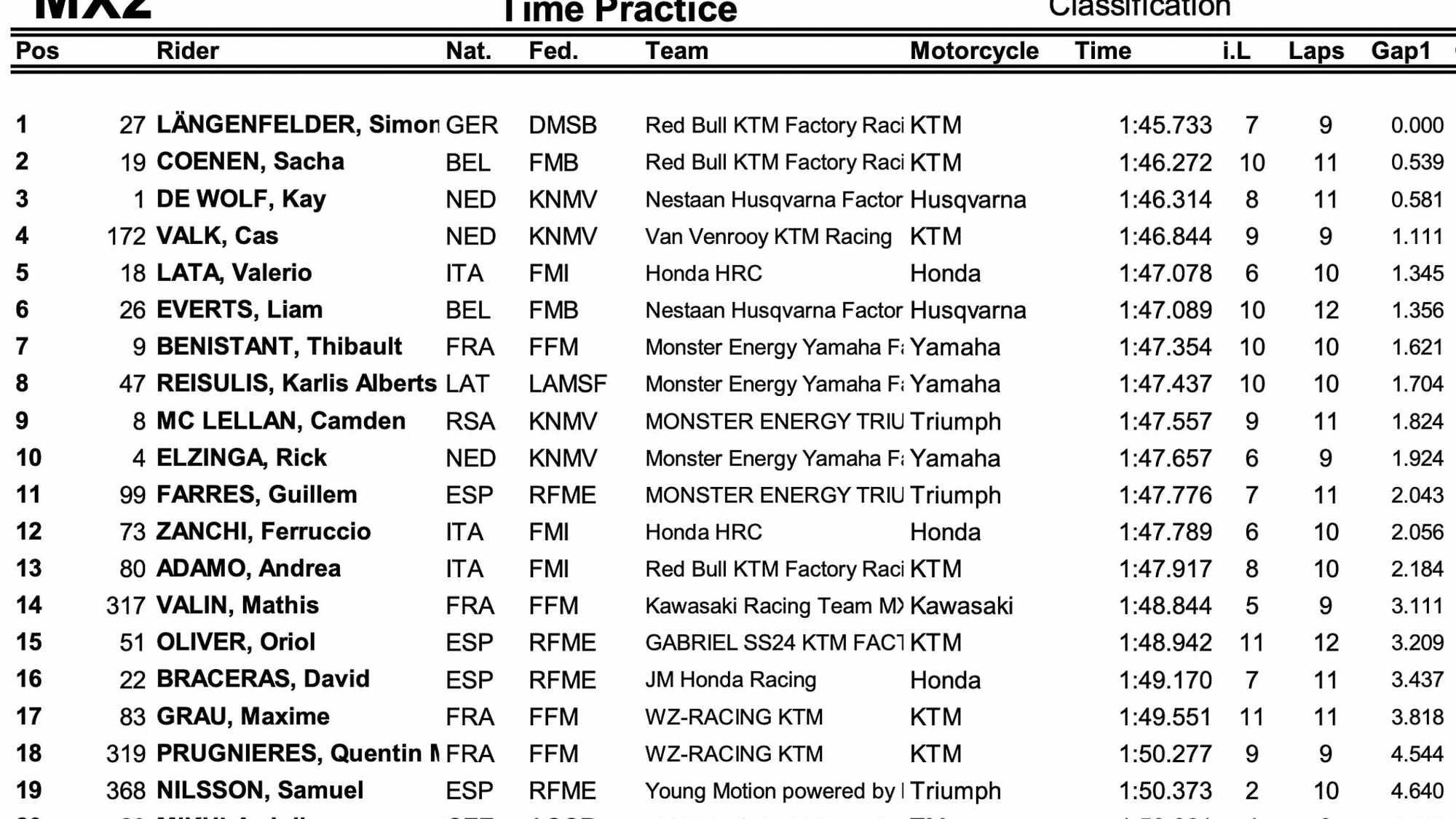 In MX2 il vincitore del Gran Premio di Svizzera, Simon Langenfelder (KTM), precede il compagno di squadra Sacha Coenen di mezzo secondo, con la tabella rossa Kay de Wolf (Husqvarna) 3° davanti a Cas Valk (KTM) e a Valerio Lata (Honda), primo degli italiani, 5°. Dodicesima posizione per Ferruccio Zanchi (Honda) che entrerà al cancello per la gara di qualifica subito prima di Andrea Adamo (KTM), 13°.