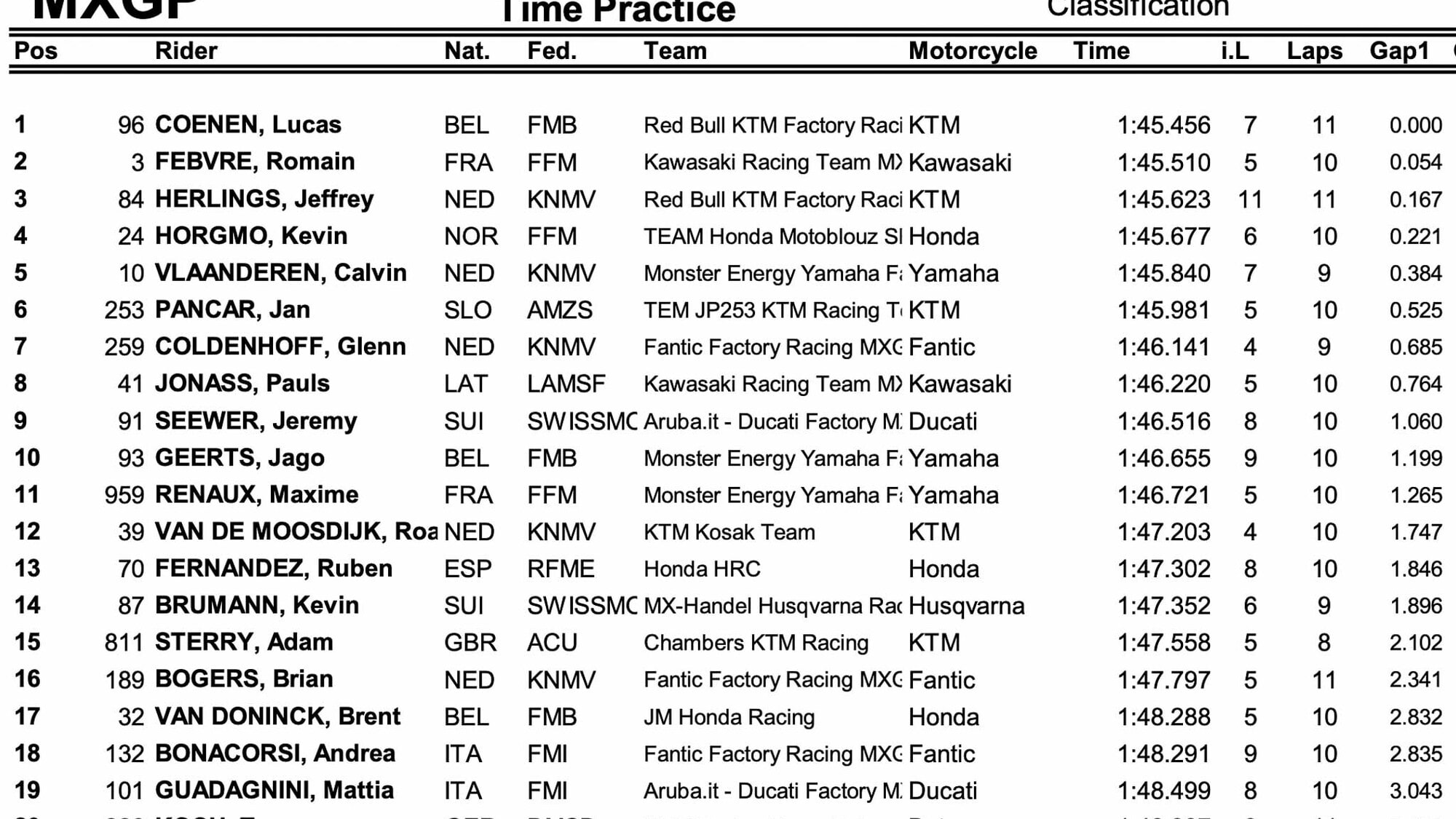 Su una pista praticamente perfetta e non ancora inondata dalle attese precipitazioni il belga sopravanza il francese di 54 millesimi, con Jeffrey Herlings (KTM), già vincitore qui in cinque occasioni, terzo davanti a Kevin Horgmo (Honda) e a Calvin Vlaanderen (Yamaha). Indietro i nostri non a loro agio sul tracciato velocissimo, duro e poco scavato a causa del temuto arrivo della pioggia, con Andrea Bonacorsi (Fantic), 18° davanti a Mattia Guadagnini (Ducati), 19° al rientro. Tra i rientranti, ottava piazza per Pauls Jonass (Kawasaki), mentre Maxime Renaux (Yamaha), non ancora al 100%, è 11°.