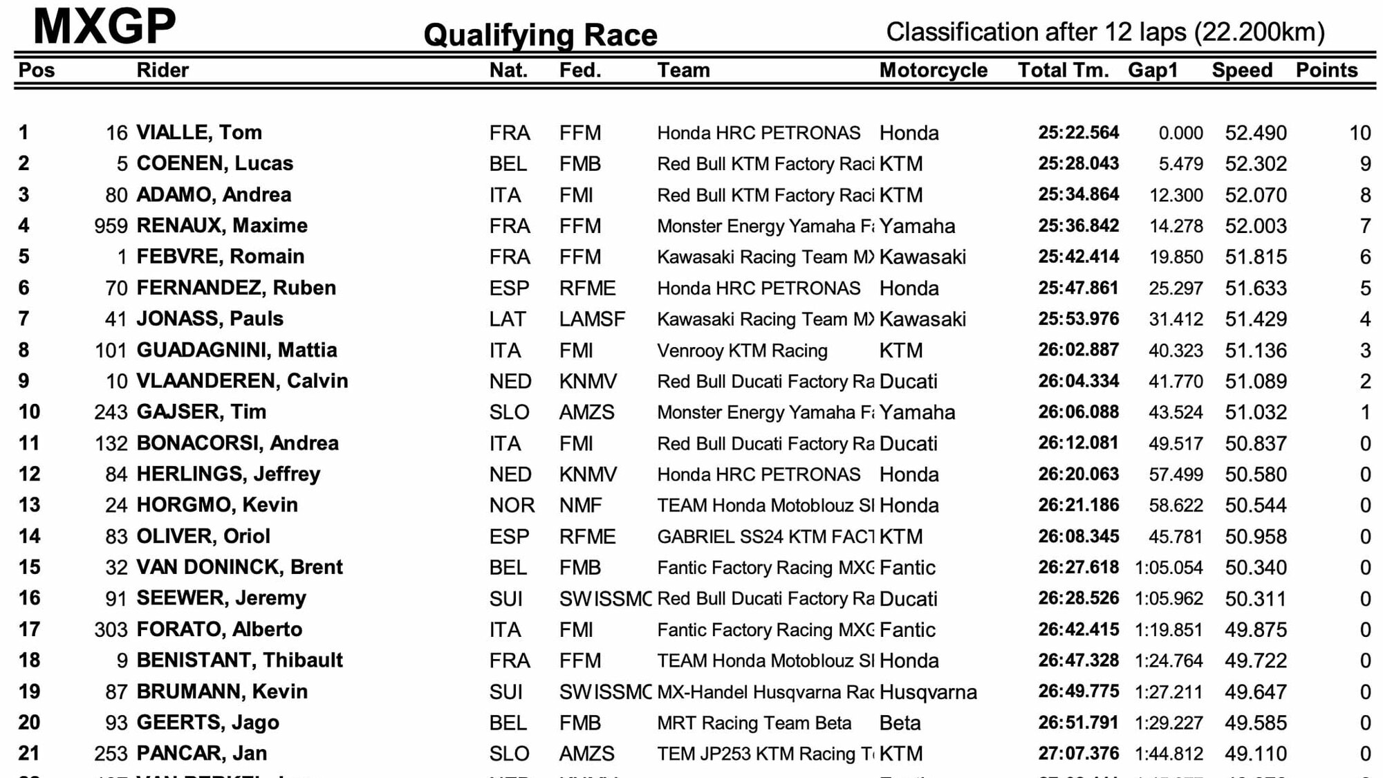 Eccellente la terza posizione di Andrea Adamo (KTM) che esordisce in grande stile nella classe regina, portando a casa una manche solida che lo vede avere la meglio su due rivali del calibro di Maxime Renaux (Yamaha) e Romain Febvre (Kawasaki) che tagliano il traguardo alle sue spalle. 7° sotto la bandiera a scacchi, Ruben Fernandez (Honda), ha la meglio su Pauls Jonass (Kawasaki) e sull’ottimo Mattia Guadagnini (KTM) che tiene a bada il ritorno di Calvin Vlaanderen al debutto sulla Ducati, con Tim Gajser (Yamaha), poco convincente e 10° dopo una scivolata.