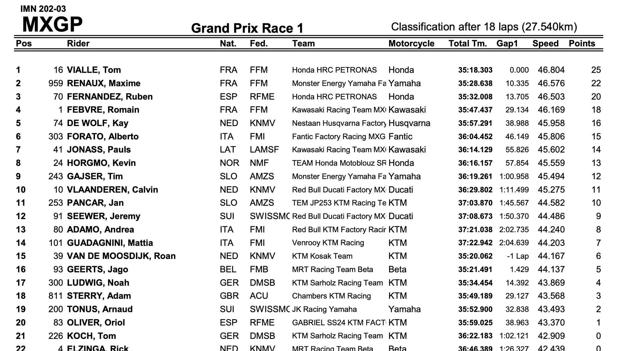 Il belga viene aiutato dai commissari di percorso a riprendere la gara quando sembrava ormai destinato al ritiro e viene per questo squalificato ma incomprensibilmente la penalità non gli viene comunicata dalla direzione gara e continua a correre con foga per recuperare punti preziosi, nonostante abbia quasi un giro di distacco. Herlings dal canto suo segue il compagno e sembra averne di più ma finisce in un canale profondo e la catena della sua Honda cade, costringendolo al ritiro. Ne approfittano Romain Febvre (Kawasaki) e Maxime Renaux (Yamaha) che salgono al 2° e 3° posto alle spalle del loro connazionale, mentre Ruben Fernandez (Honda), passato Andrea Adamo (KTM), spinge per raggiungere i due davanti a lui, con Alberto Forato (Fantic) che risale dopo una partenza fuori dalla top 10.