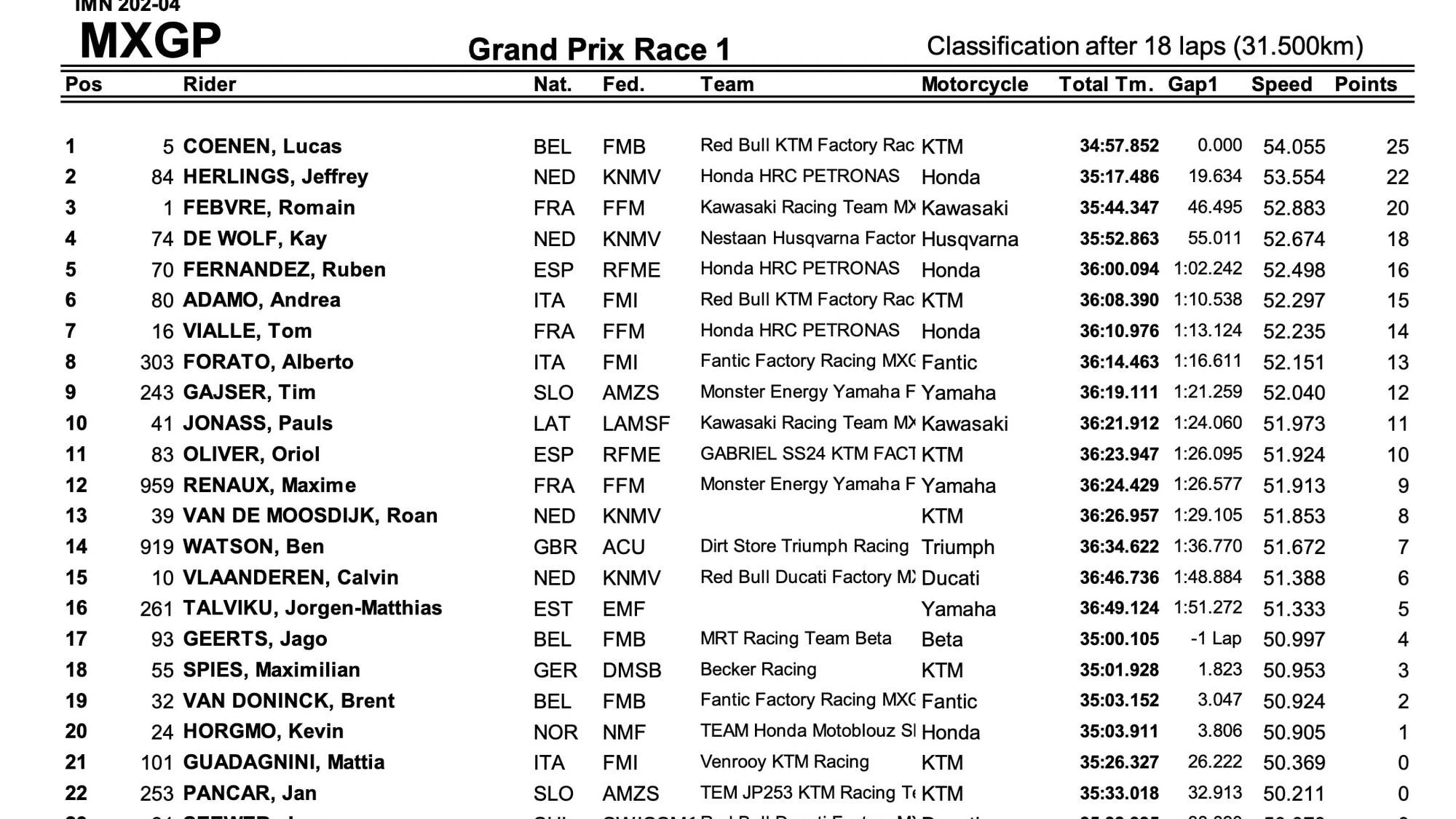 L’olandese gestisce senza problemi fino al traguardo, chiudendo davanti a Febvre che finisce a terra ma salva il 3° posot e a Kay de Wolf (Husqvarna), irruento e sgraziato nel passare e buttare a terra Vialle che perde la bussola e chiude 7° alle spalle di Ruben Fernandez (Honda), autore di una buona prova e di un solido Andrea Adamo (KTM) 6°. Convince Alberto Forato (Fantic), ottimo 8° che riesce a terminare davanti a Tim Gajser (Yamaha), caduto in avvio di manche. Male Mattia Guadagnini (KTM), 21° dopo una caduta e Andrea Bonacorsi (Ducati) che era 10° quando la sua moto lo abbandona.