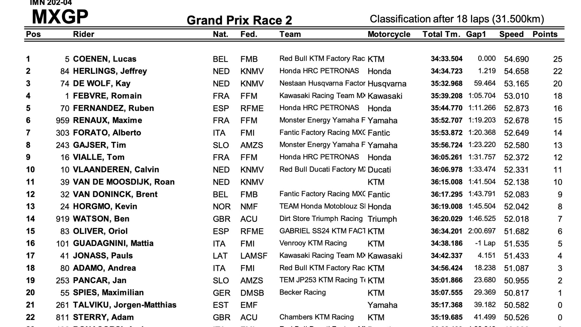 Nel finale Coenen sbaglia a più riprese, dando l’illusione a Herlings di poterlo riacciuffare ma con il belga risponde agli attacchi dell’olandese della HRC, tagliando il traguardo primo davanti al pilota della HRC che chiude a 1 secondo. Terzo posto per de Wolf che sale per la prima volta sul podio della MXGP alle spalle di Coenen ed Herlings, mentre Febvre è 4° sul traguardo e nella assoluta di giornata, dove precede Ruben Fernandez (Honda), con Alberto Forato (Fantic), stupendo 6° assoluto dopo il 7° posto di gara due alle spalle di Maxime Renaux (Yamaha) e davanti a Tim Gajser (Yamaha) a terra dopo 3 giri.