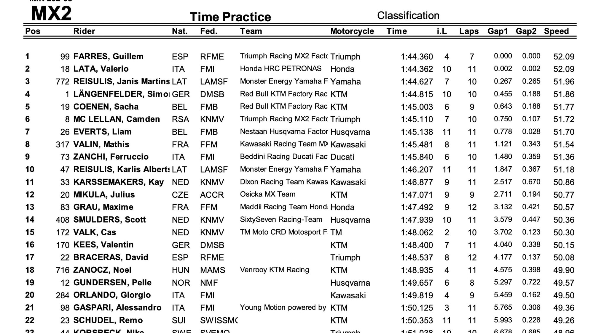 In MX2 è Guillen Farres (Triumph) il pilota che sceglierà per primo il cancello di partenza della gara di qualifica della MX2, con Valerio Lata (Honda), più veloce di tutti nelle libere del mattino, 2° a 2 soli millesimi dallo spagnolo. 3° posto per Janis Reisulis (Yamaha) con la tabella rossa della MX2, Simon Längenfelder (KTM), 4° davanti a Sacha Coenen (KTM). Nona posizione per Ferruccio Zanchi (Ducati).
