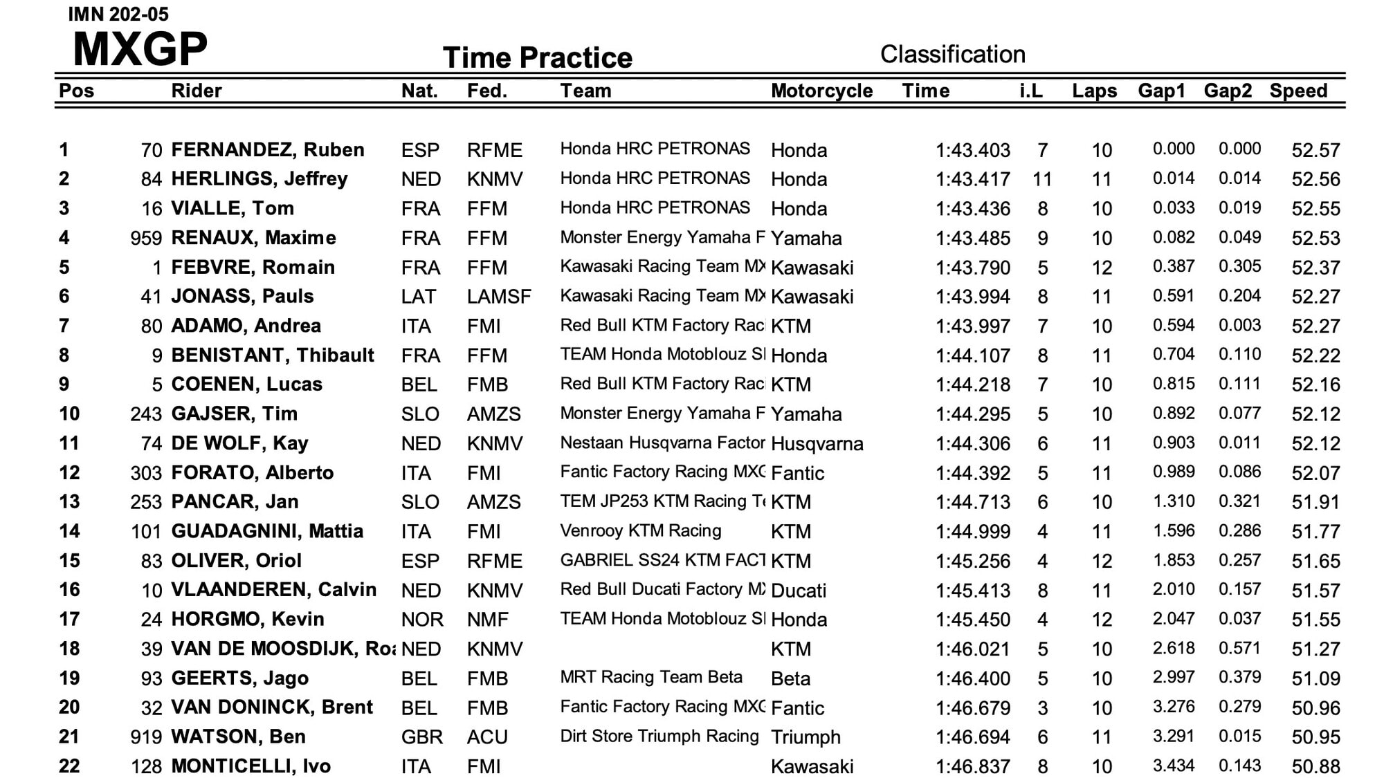 Davanti Tom Vialle e Jeffrey Herlings confermano il buon momento dello squadrone Honda, con Maxime Renaux (Yamaha) a meno di un decimo dal primo e il Campione del Mondo in carica, Romain Febvre (Kawasaki), 5° davanti al compagno dei squadra Pauls Jonass. Settima piazza per il primo dei nostri, con Andrea Adamo (KTM) che precede un sorprendente Thibault Benistant (Honda) e la tabella rossa della classe regina, Lucas Coenen (KTM) al nono posto. 12° tempo per Alberto Forato(Fantic), con Mattia Guadagnini (KTM) 14°, Ivo Monticelli (Kawasaki) 21°, Andrea Bonacorsi (Ducati) 24° e Nicholas Lapucci (Honda) 25°.
