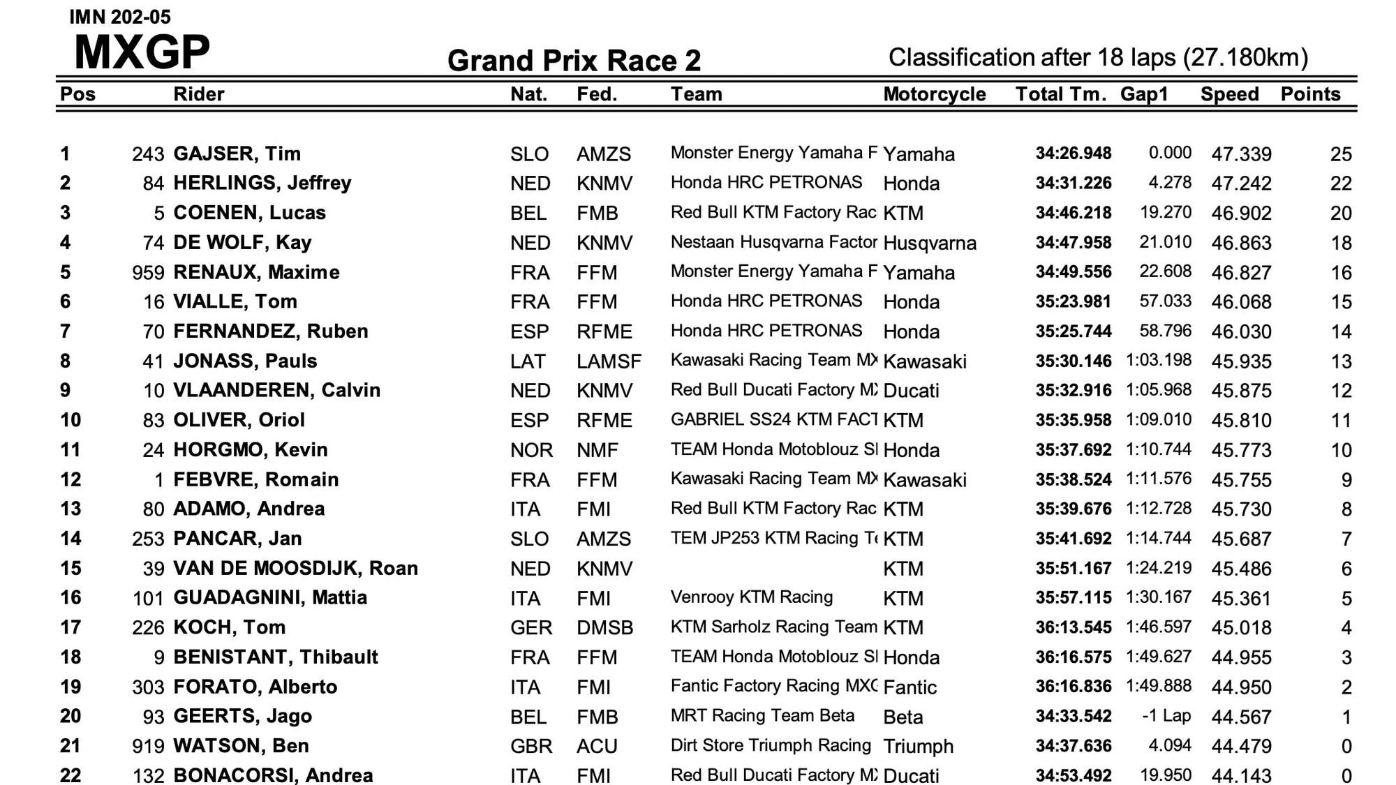 Coenen riesce a resistere a de Wolf e chiude 3°, salvando la tabella rossa con 4 punti di vantaggio su Herlings che vince il 114° Gran Premio della sua incredibile carriera. Renaux chiude 5° alle spalle di de Wolf, con Vialle 6° e sul terzo gradino del podio che consolida la terza piazza in campionato. Gara complicata per Febvre che termina 12° davanti a uno sfortunato Andrea Adamo (KTM), rallentato mentre era 10°. Meno bene del previsto anche gli altri italiani, con Mattia Guadagnini (KTM) 16°, Alberto Forato (Fantic) 19° e Andrea Bonacorsi (Ducati) 22°.