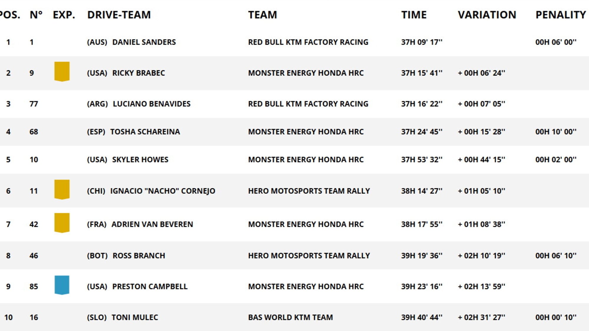 Anche la prima parte della Marathon corsa la prima settimana, la Tappa 4, aveva sorriso a Tosha Schareina. Il pilota spagnolo di HRC ha saputo sfruttare gli errori di navigazione commessi dagli avversari per aggiudicarsi la seconda tappa di questa Dakar. Al bivacco, dove i piloti riposeranno dopo i 418 km di speciale completati oggi, Schareina ha totalizzato 4'35” di vantaggio su Daniel Sanders. Il pilota australiano di KTM, che festeggia il 2° posto di tappa, si riprende la leadership nella classifica generale che aveva perso ieri proprio dal compagno di squadra Luciano Benavides. L'argentino ha ceduto la vetta nella generale al compagno a causa di un errore di navigazione commesso nei primi chilometri di tappa. Benavides, apripista dopo la vittoria di ieri, ha perso minuti preziosissimi nella lotta per la classifica generale: sono 11'50” i minuti persi da Schareina nella tappa, che valgono all'argentino il 9° posto di giornata. L'errore gli è costato non solo la vetta della generale, ma anche il 2° posto: ora Benavides è 3° a 7'5” da Sanders, ma solamente 41” dietro Ricky Brabec. Lo statunitense di Honda ha chiuso la Tappa 9 al 4° posto davanti ai compagni di marca Skyler Howes (7'54”) e Adrien van Beveren (10'10”), rimanendo comunque piuttosto distante da Sanders.
