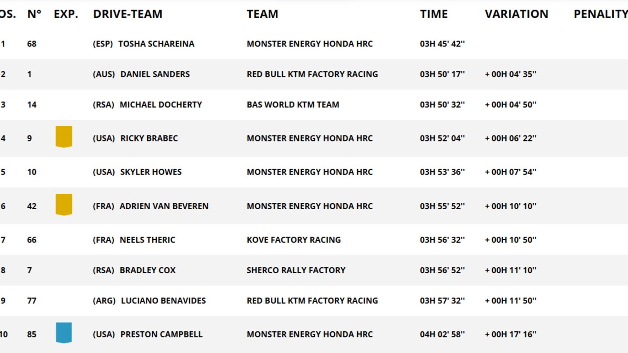 A concludere il podio di tappa è Michael Docherty, che si prende il 6° successo parziale nella categoria Rally2 in questa edizione. Il pilota sudafricano, abbandonato il sogno di lottare per la classifica generale settimana scorsa, non ha più nulla da perdere. La velocità certo non gli manca, come ha dimostrato oggi chiudendo a soli 4'50” da Schareina e 15” da Sanders. Ci sono altri due piloti Rally2 in top 10: Neels Theric porta la Kove al 7° posto, mentre il leader della generale di classe Preston Campbell è 10°. Ottimi risultati anche per gli italiani Paolo Lucci e Tommaso Montanari, che chiudono uno stage complicato rispettivamente al 18° (18'39”) e 21° (20'40”) posto assoluti. Ma la vera sfida sarà domani: i 371 km di speciale che chiuderanno la seconda ed ultima Marathon della Dakar 2026 potrebbero rivelarsi fondamentali per le ambizioni di vittoria finale di alcuni piloti.