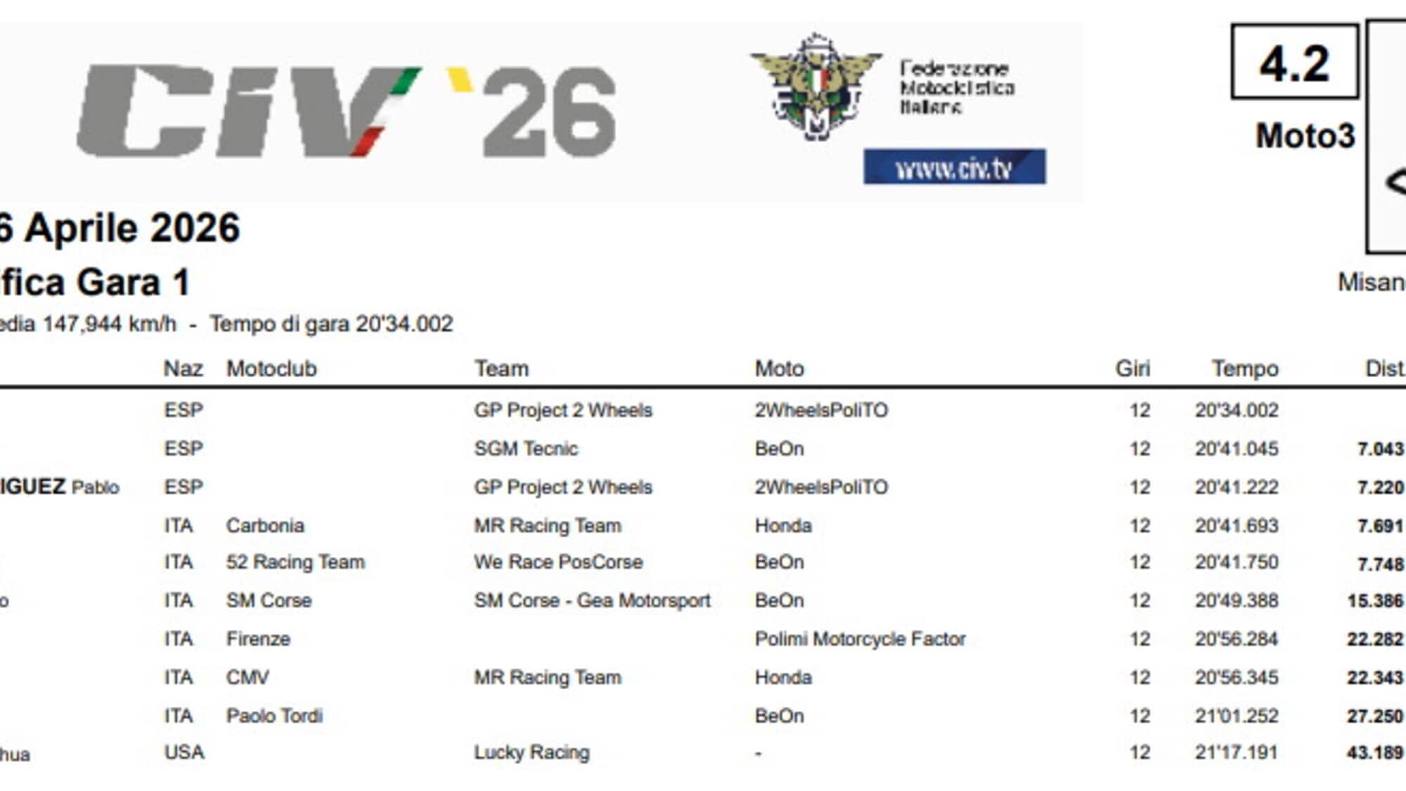 È tornato il dominatore della Moto3 italiana: Vicente Pérez Selfa festeggia con una vittoria il suo ritorno nel Dunlop CIV al termine di una gara dominata. È un podio tutto spagnolo: oltre a Pérez Selfa, sul podio anche Victor Cubeles e Pablo Olivares Rodriguez.