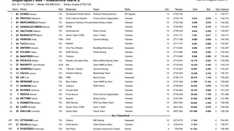 Alle spalle di Stirpe, la volata per le altre posizioni del podio ha premiato Massimo Roccoli, secondo ad una manciata di millesimi dal vincitore, e Roberto Mercandelli, nuovamente protagonista dopo il trionfo di Gara 1 con la Yamaha R6 del team Rosso&Nero. In top five anche lo spagnolo Manuel Gonzalez e Stefano Valtulini, tutti racchiusi in appena sei decimi di secondo.