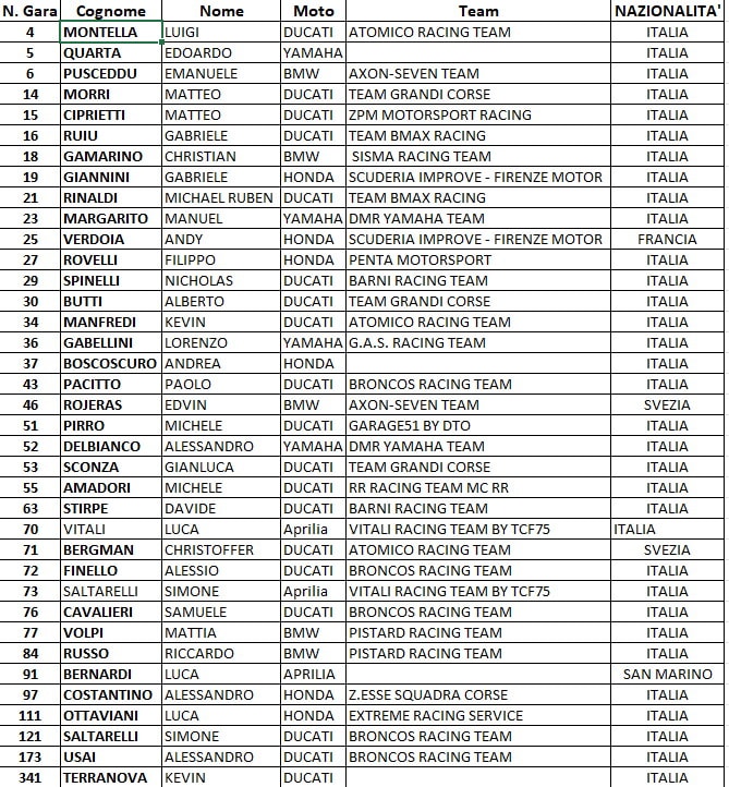 Da poco più di una dozzina al via nel 2024, alla griglia piena nel 2026. La formula “Production Bike” ha funzionato, allargando in maniera sensibile il campo dei partenti della classe regina del Dunlop CIV. Tra i 37 piloti al via tantissimi nomi di rilievo, a partire da quello del Campione Italiano in carica Alessandro Delbianco, che nonostante l’assenza a Imola e Cremona (concomitanze con il FIM EWC) proverà a difendere il titolo dagli assalti di Michael Ruben Rinaldi con la Ducati del Bmax Racing Team e da quello degli altri ducatisti Michele Pirro (Garage51, in cerca del suo undicesimo tricolore), Samuele Cavalieri (Broncos Racing) e Davide Stirpe (Barni Spark Racing Team). Tante anche le Honda al via con Gabriele Giannini (Scuderia Improve), velocissimo nei test ma anche il Campione Italiano SSP in carica Luca Ottaviani passato in SBK sempre con Extreme Racing Service e Filippo Rovelli con la CBR1000RR-R di Penta Motorsport. Non mancano comunque molti volti noti del CIV e dei vari Mondiali come Christian Gamarino e Riccardo Russo con le BMW S1000RR rispettivamente di Sisma Racing e Pistard Racing,