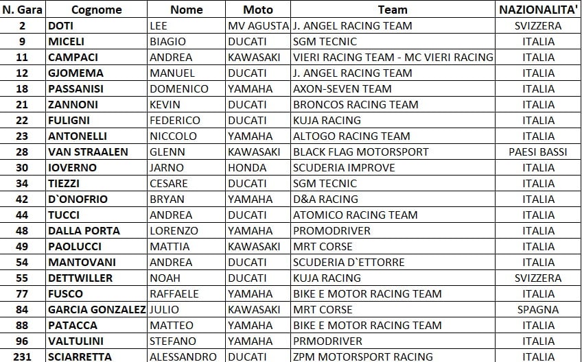 L’introduzione della nuova SBK ha inevitabilmente tolto moto alla classe di mezzo, che però mantiene il suo solito livello elevato. A spiccare sono i nomi degli ex Mondiale Niccolò Antonelli (Yamaha R9 del Team AltoGo), Julio Garcia (Kawasaki MRT Corse), Lorenzo Dalla Porta (Yamaha Promodriver) e Glenn Van Straalen (Kawasaki Blackflag Motorsport). A loro si aggiungono i veterani del CIV, sempre velocissimi e pronti a dare battaglia come Andrea Mantovani con la Ducati Panigale V2 della Scuderia D’Ettorre e Kevin Zannoni, tornato nel CIV dopo l’esperienza in MotoE già nel finale della passata stagione con il Broncos Racing Team.