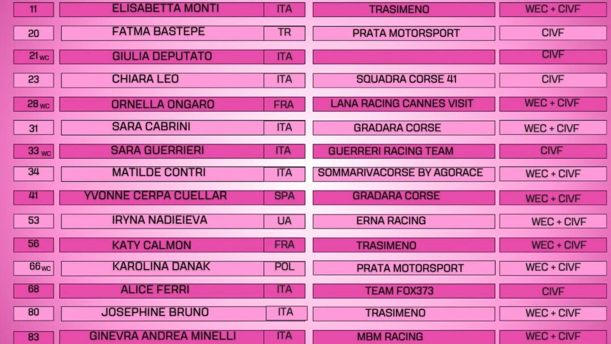 CIV Femminile e WEC, svelate le entry list per il 2026